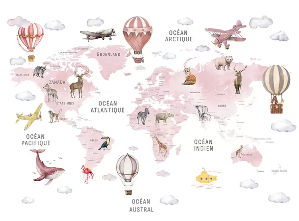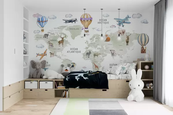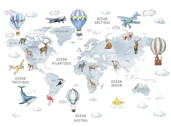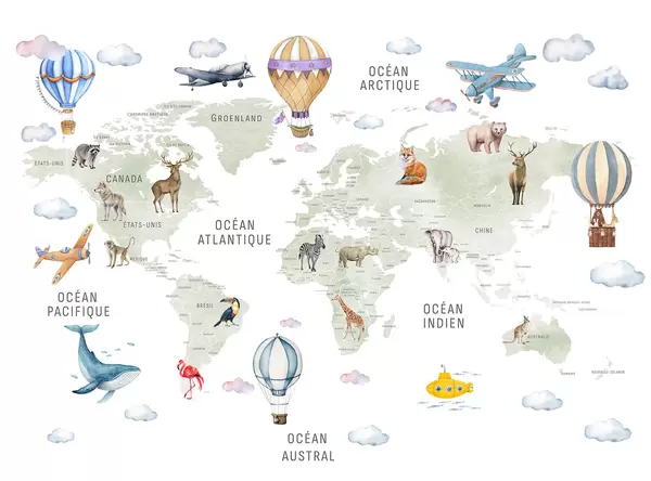 Papier peint Carte pour enfants au style aquarelle avec des animaux et des montgolfières. En français. Couleur verte. N° c00001fr