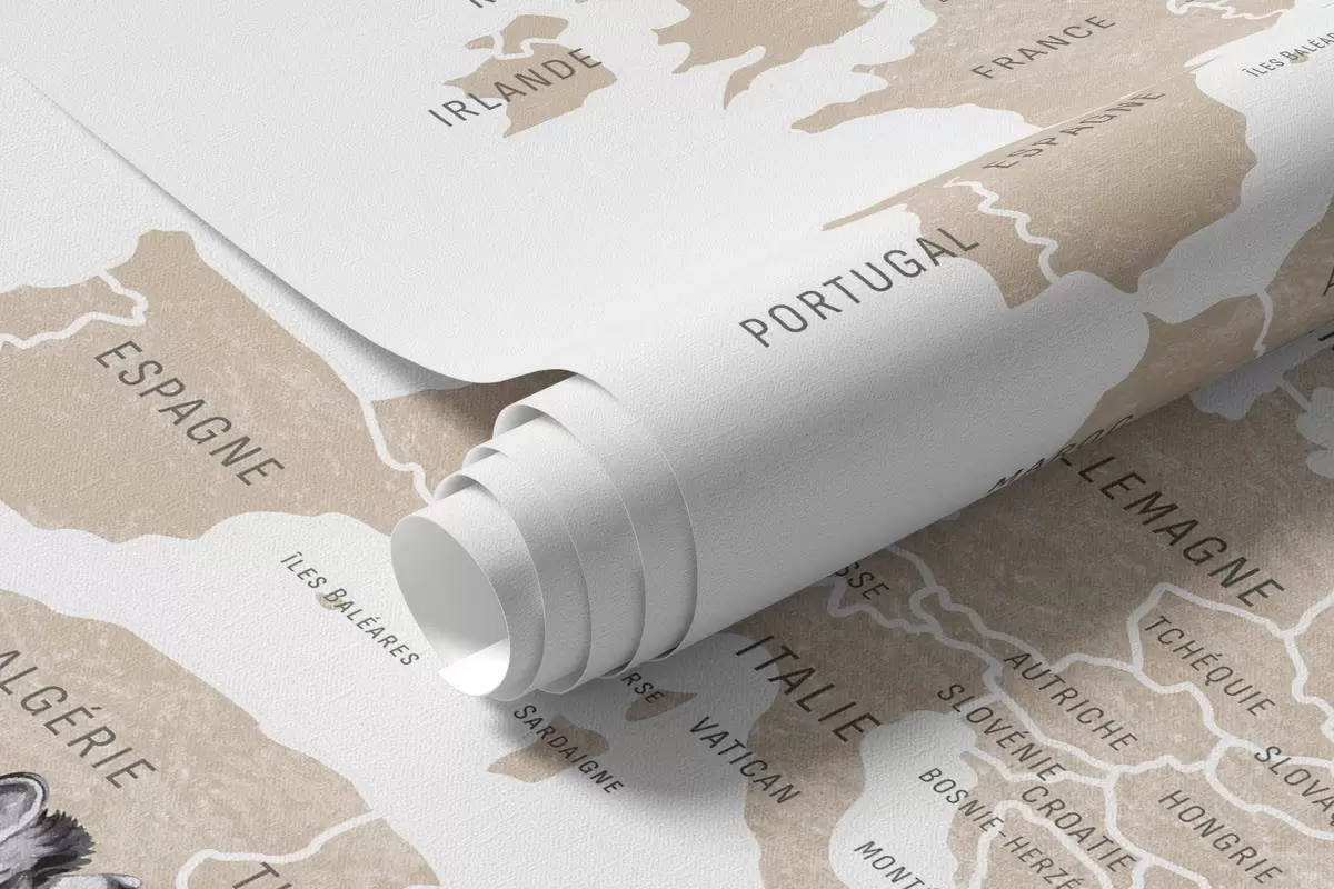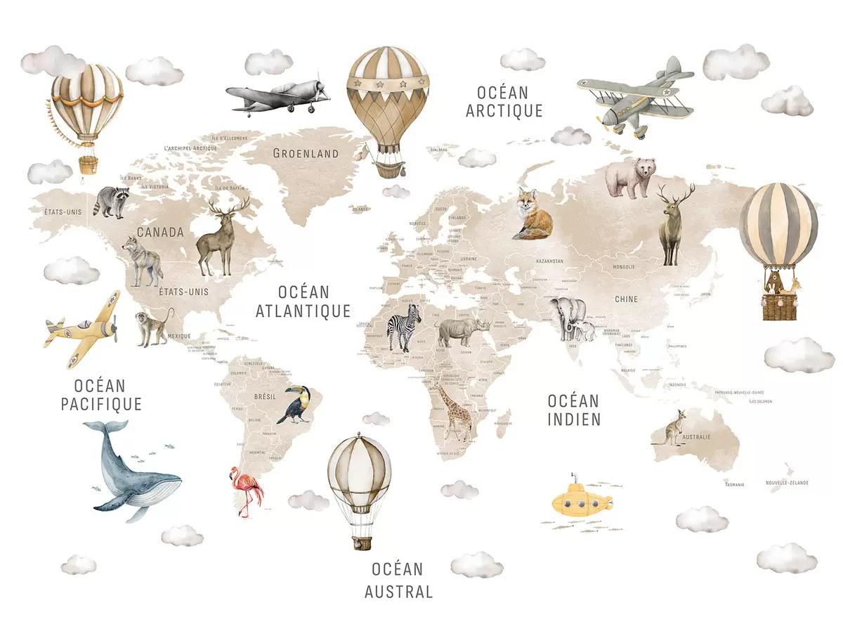 Papier peint Carte pour enfants au style aquarelle avec des animaux et des montgolfières. En français. Couleur beige. N° c00001frv2