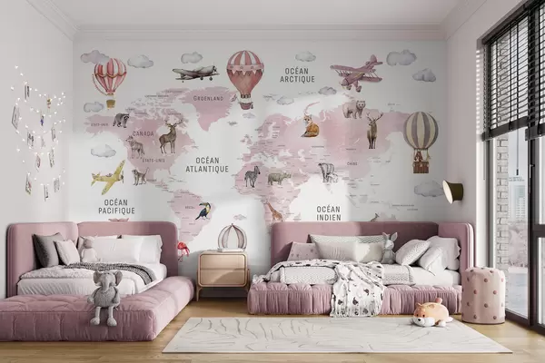 Papier peint Carte pour enfants au style aquarelle avec des animaux et des montgolfières. En français. Couleur rose. N° c00001frv3