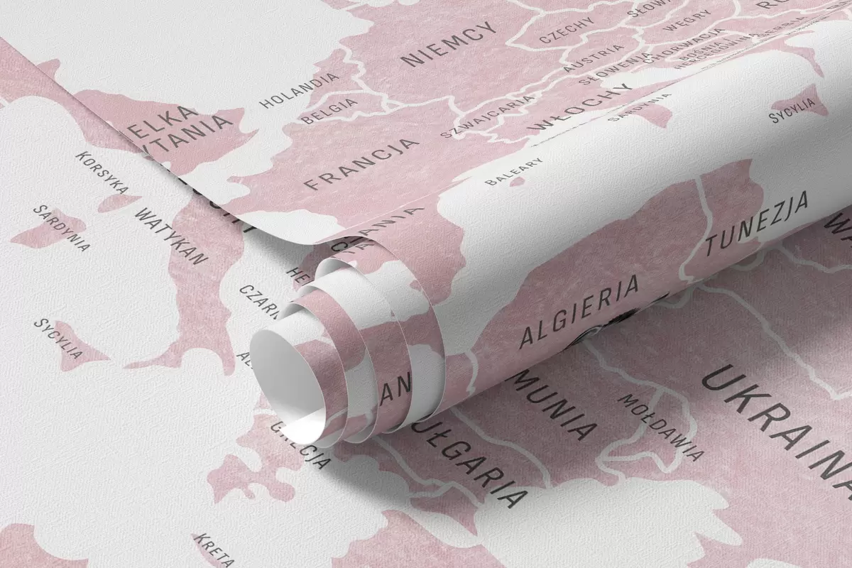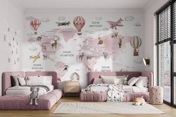 Papier peint Carte pour enfants au style aquarelle avec des animaux et des montgolfières. En polonais. Couleur rose. N° c00001plv3