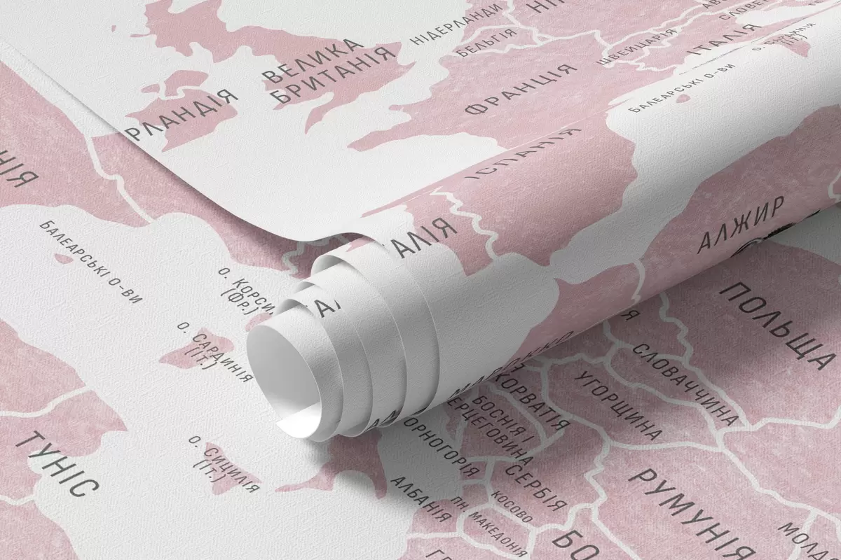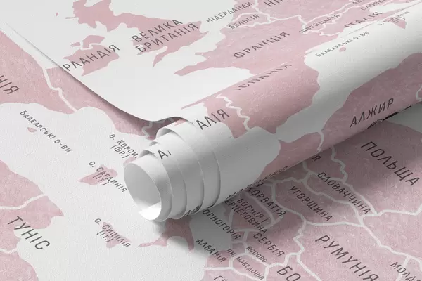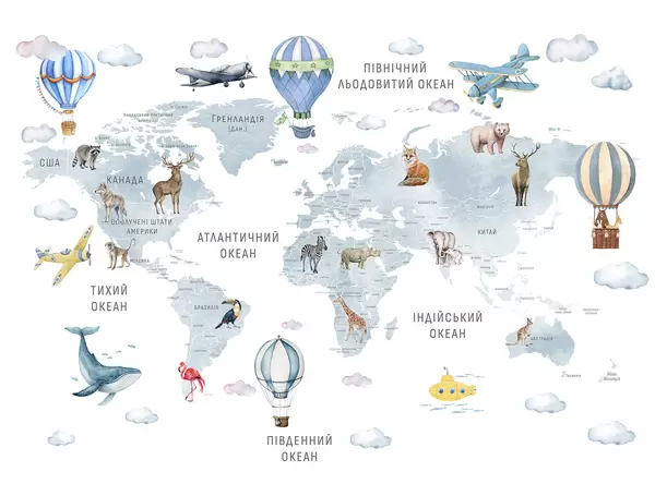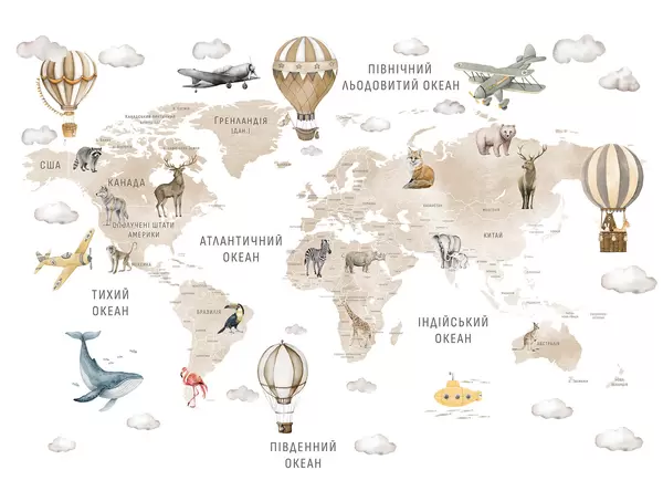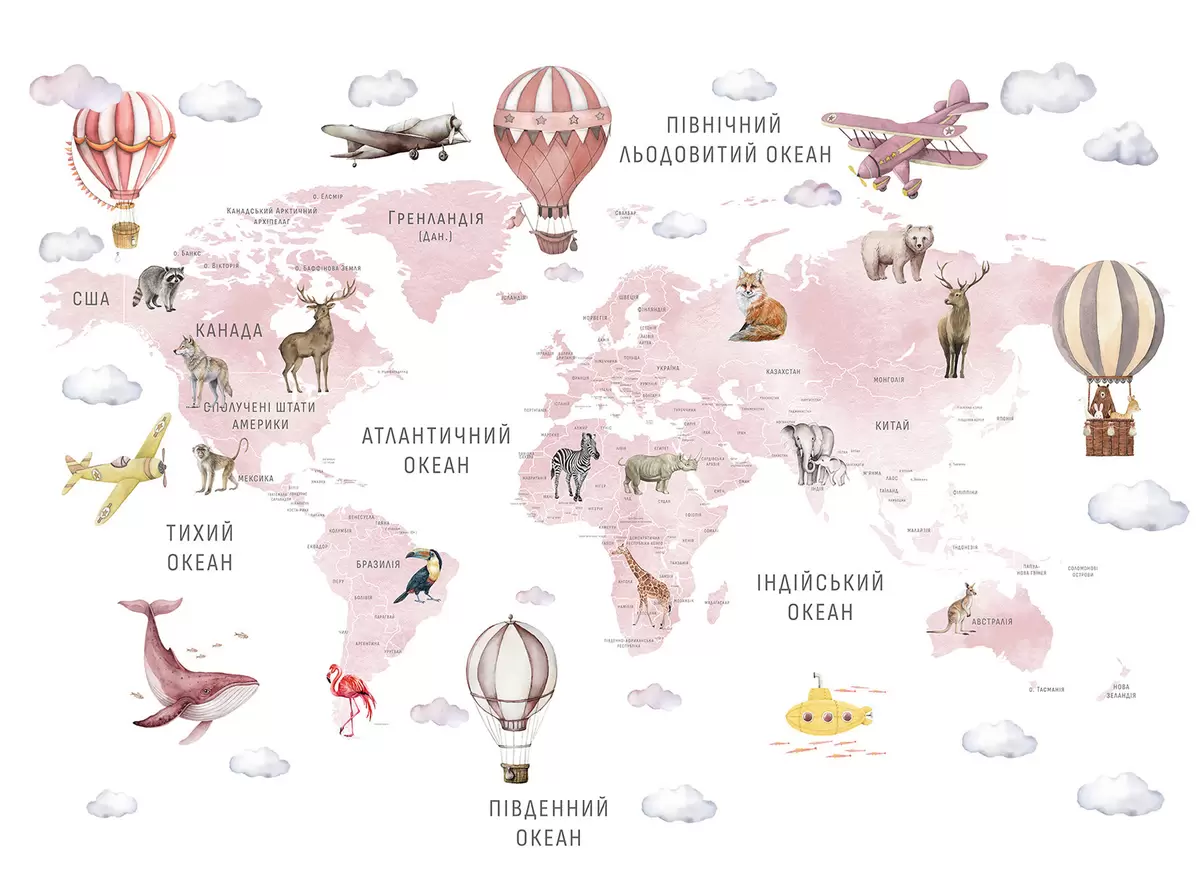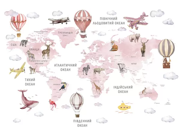 Papier peint Carte pour enfants au style aquarelle avec des animaux et des montgolfières. En ukrainien. Couleur rose. N° c00001ukv3