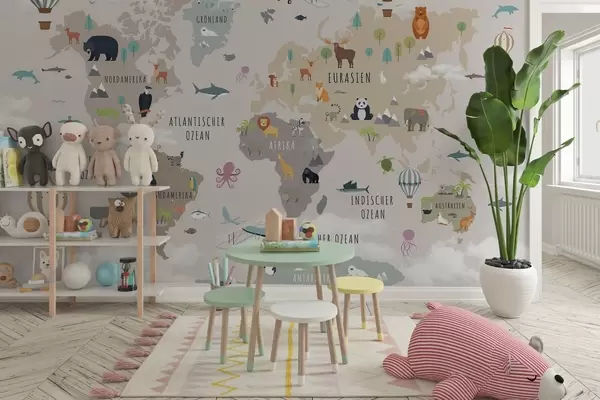 Papier peint Carte du monde pour enfants avec des animaux et des montgolfières. En allemand. N° c00002de