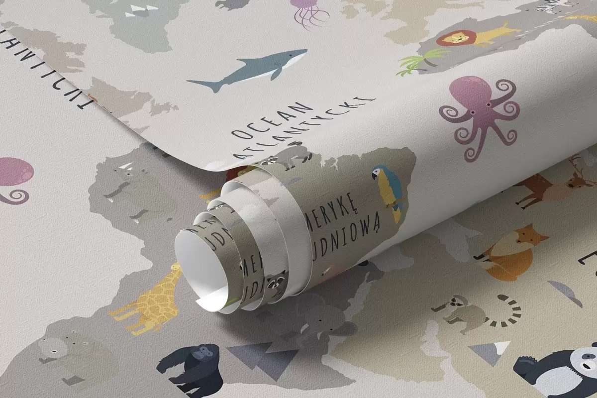 Papier peint Carte du monde pour enfants avec des animaux et des montgolfières. Langue polonaise. N° c00002pl