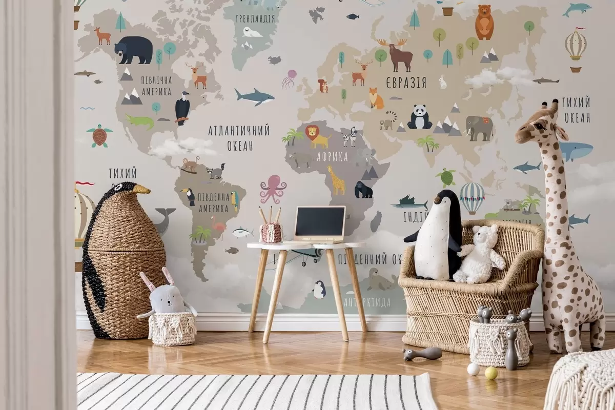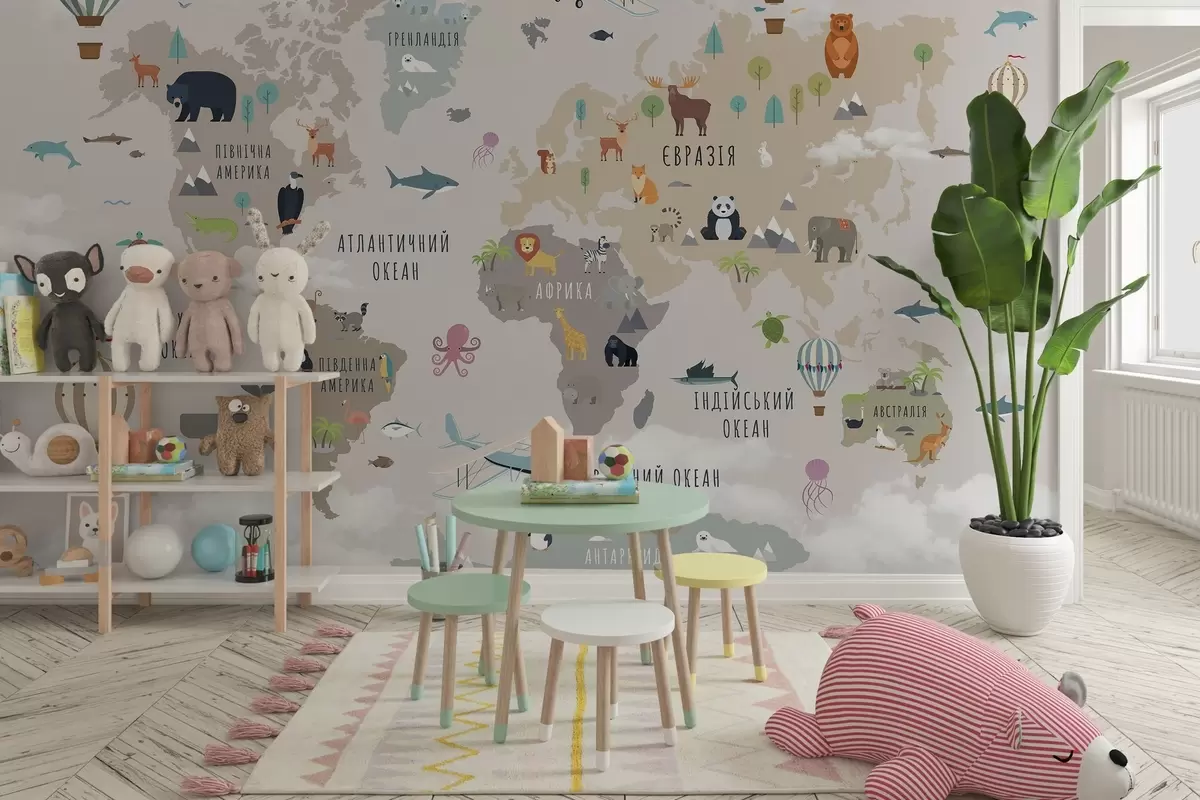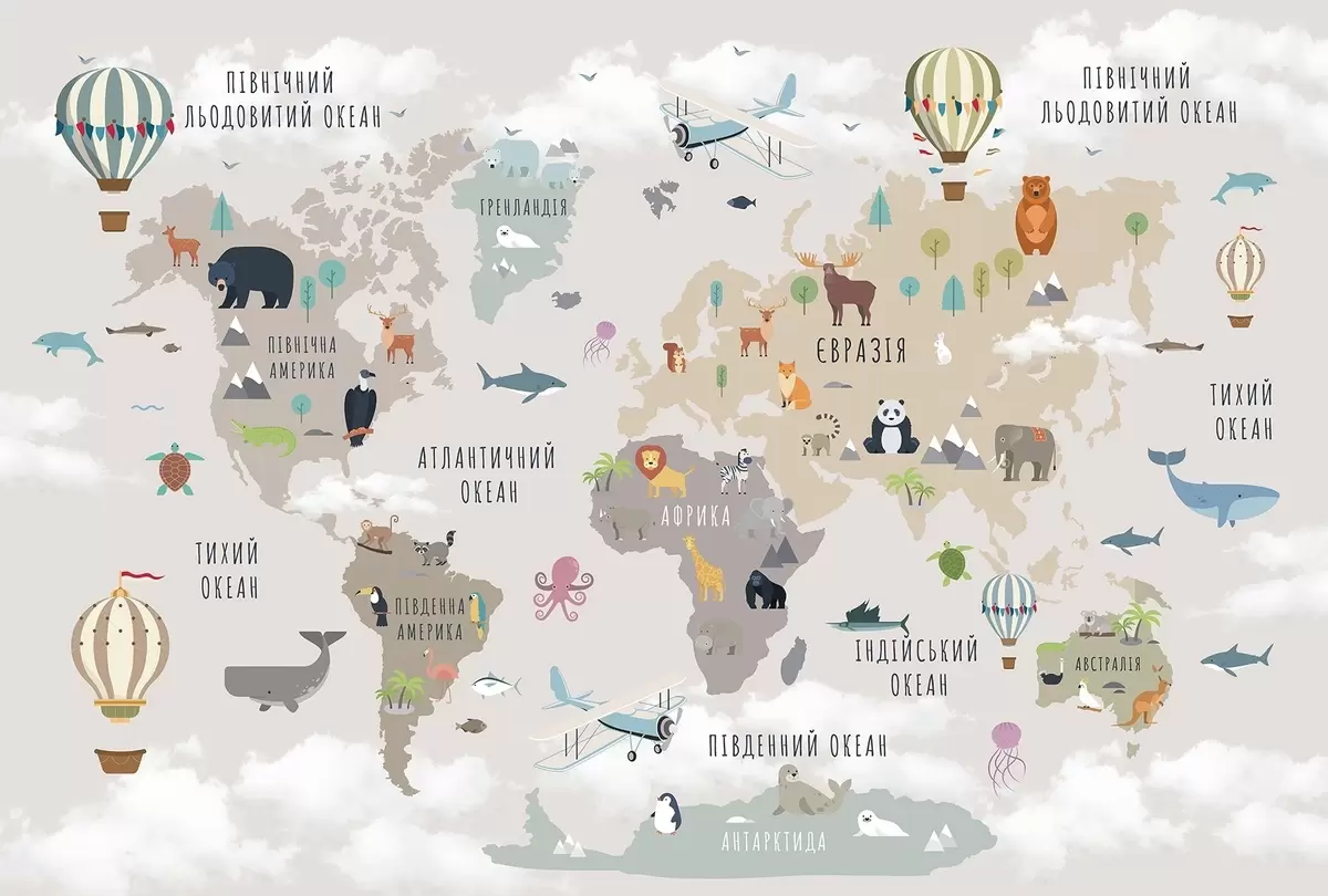 Papier peint Carte du monde pour enfants avec des animaux et des montgolfières. Langue ukrainienne N° c00002uk