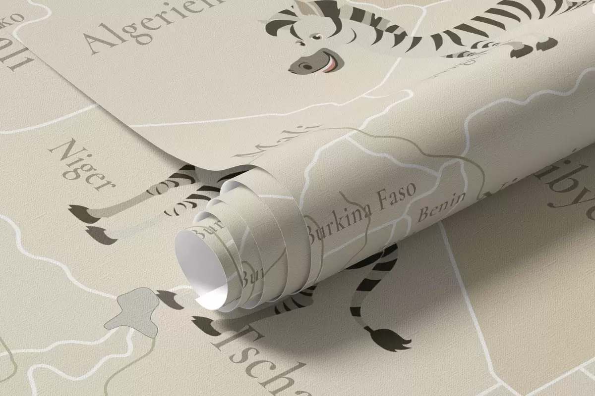 Papier peint Carte du monde pour enfants avec des animaux, des avions et des montgolfières. En allemand. Couleur beige. N° c00003de