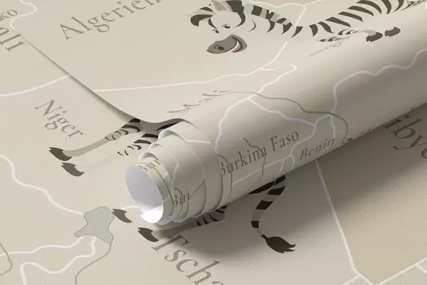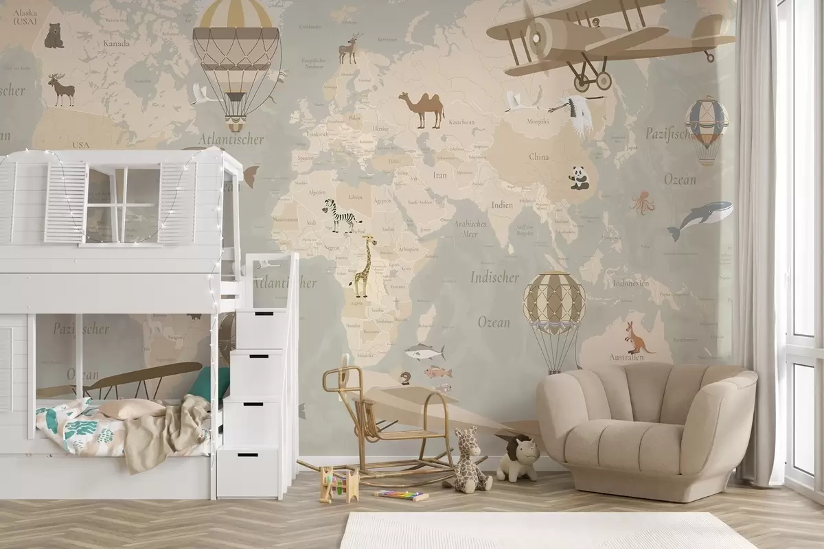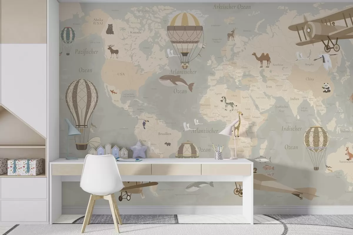 Papier peint Carte du monde pour enfants avec des animaux, des avions et des montgolfières. En allemand. Couleur beige N° c00003de