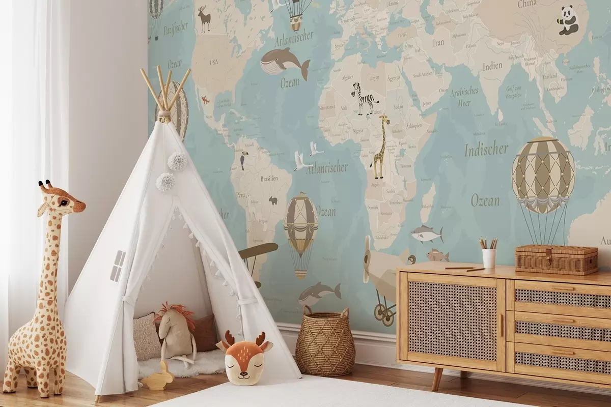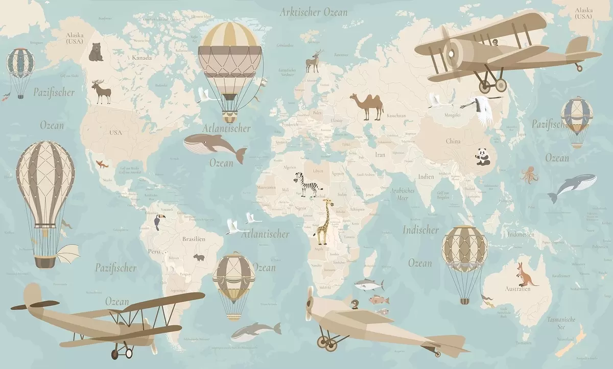 Papier peint Carte du monde pour enfants avec des animaux, des avions et des montgolfières. En allemand. Couleur bleue. N° c00003dev1