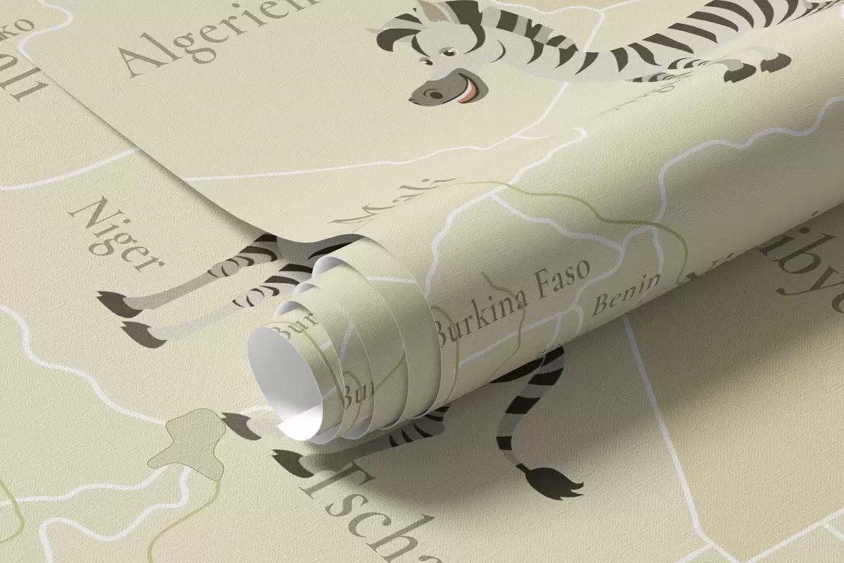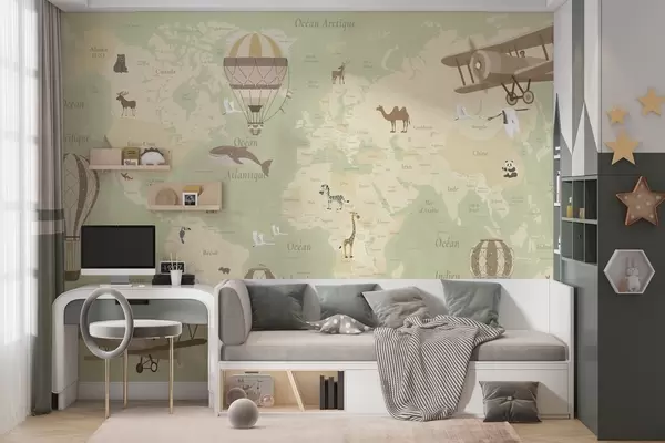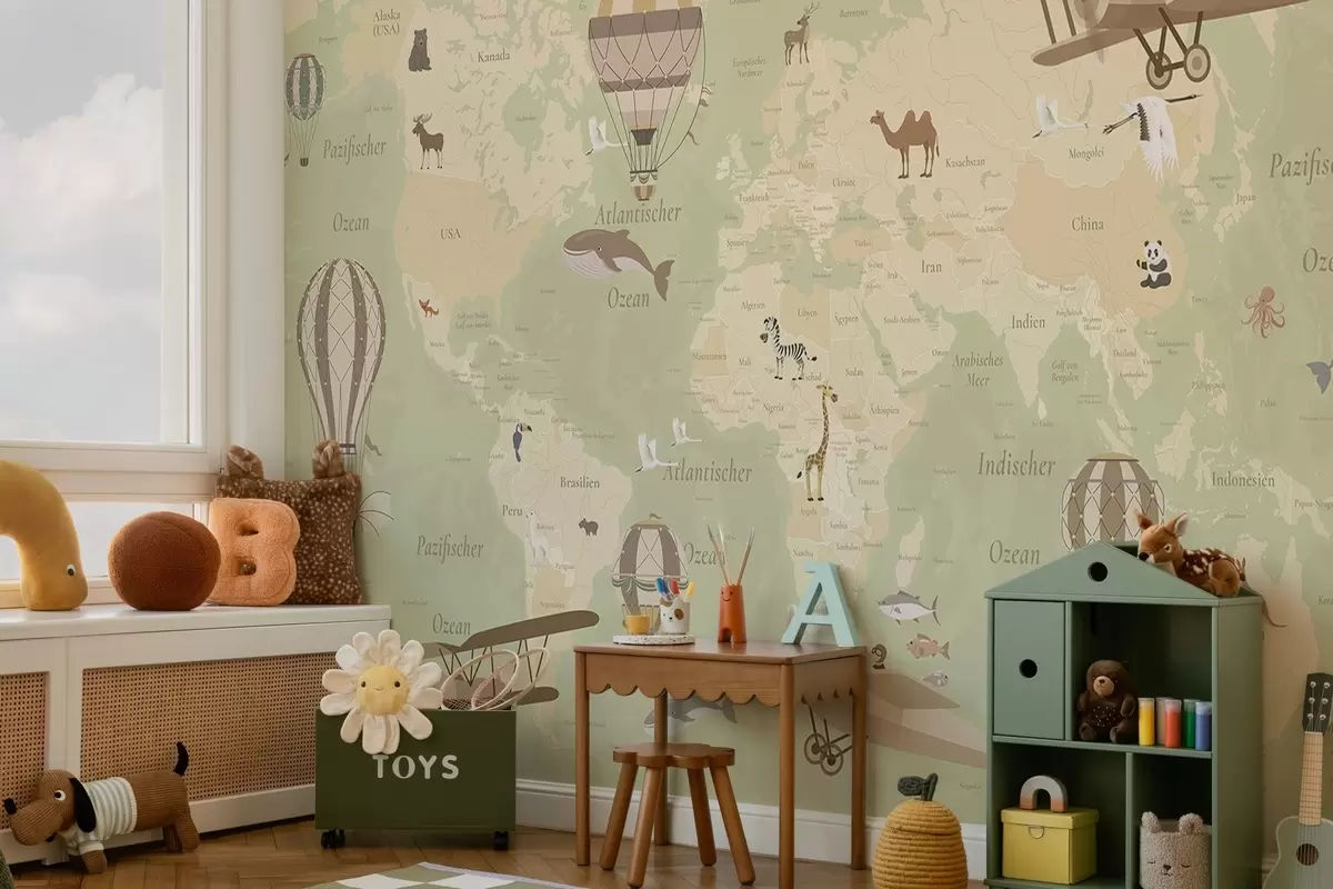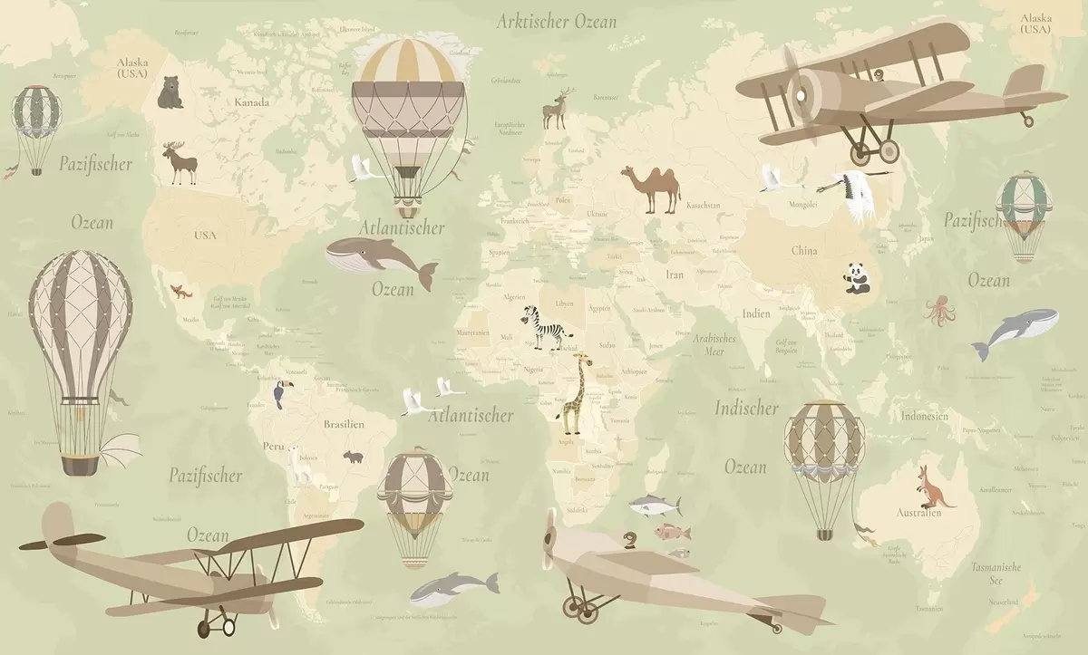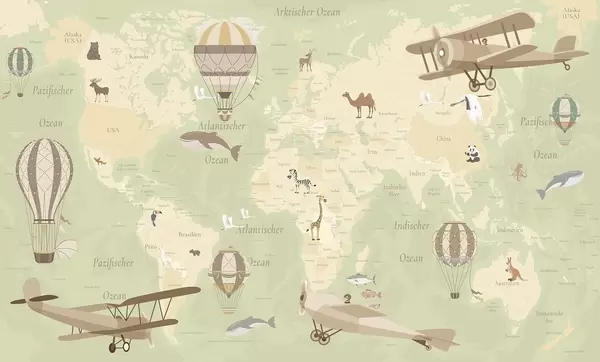 Papier peint Carte du monde pour enfants avec des animaux, des avions et des montgolfières. En allemand. Couleur verte. N° c00003dev2