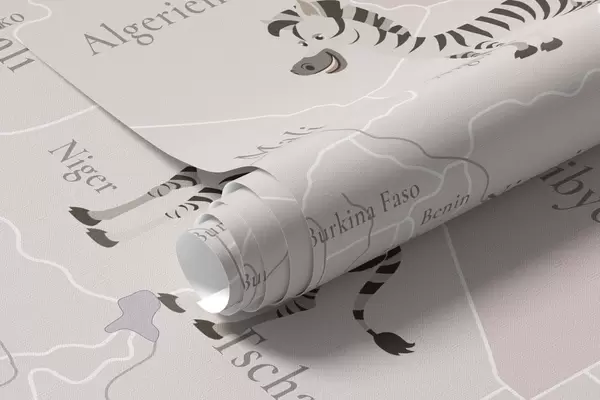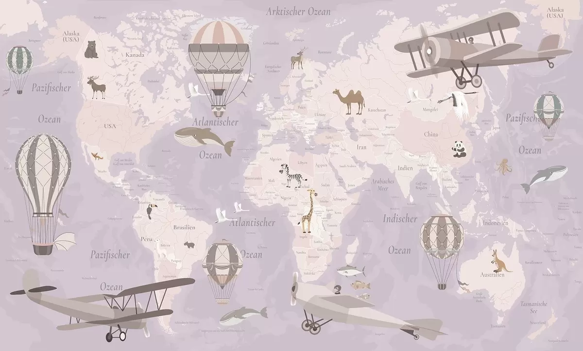 Papier peint Carte du monde pour enfants avec des animaux, des avions et des montgolfières. En allemand. Couleur violette. N° c00003dev4