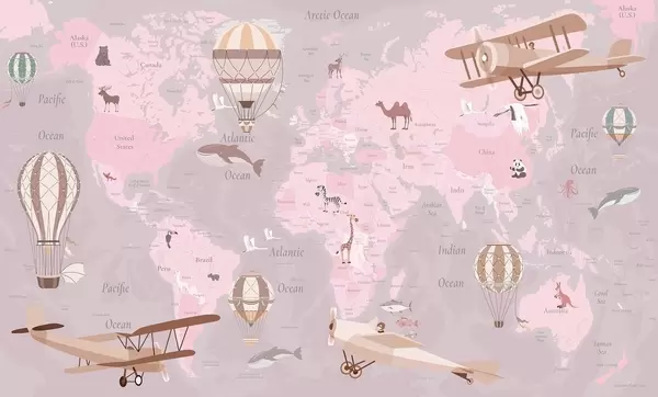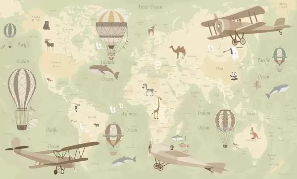 Papier peint Carte du monde pour enfants avec des animaux, des avions et des montgolfières. En anglais. Couleur beige. N° c00003en
