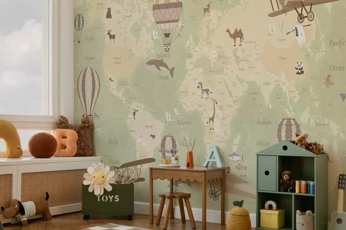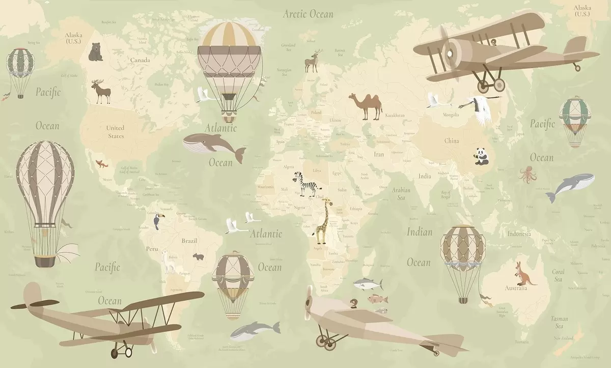 Papier peint Carte du monde pour enfants avec des animaux, des avions et des montgolfières. En anglais. Couleur verte. N° c00003env2