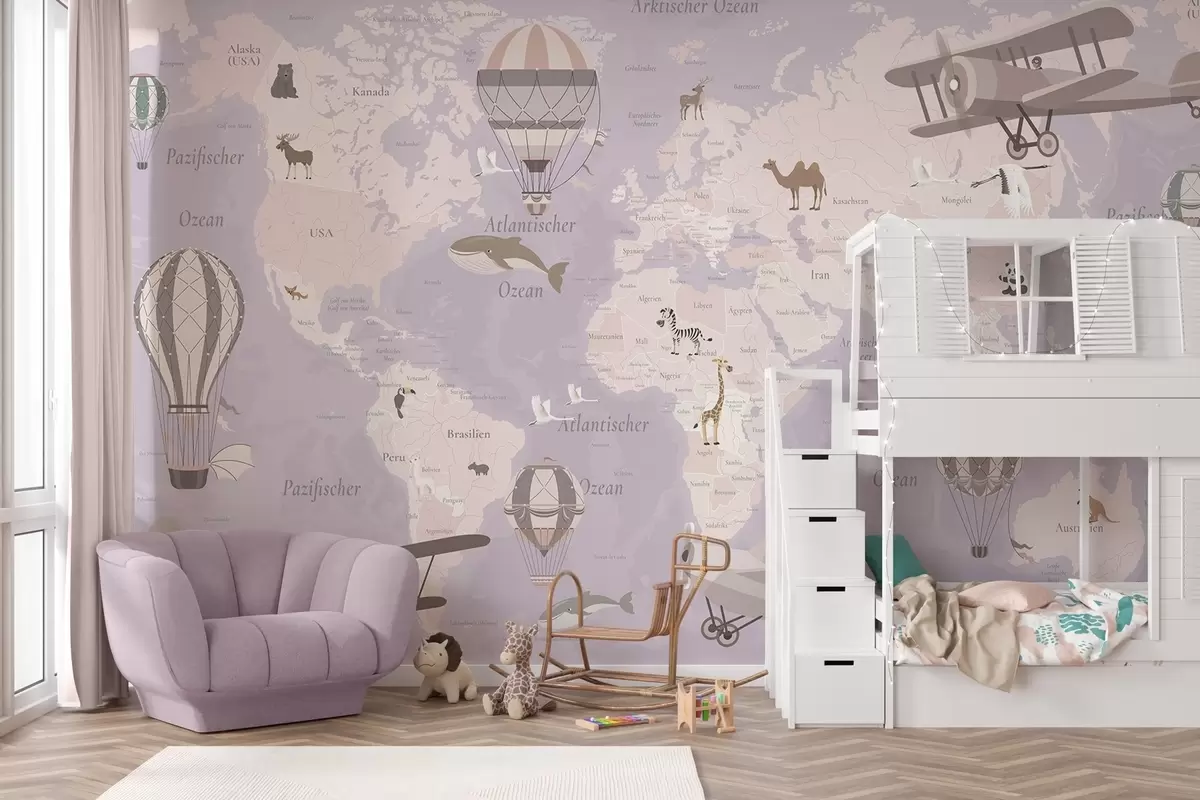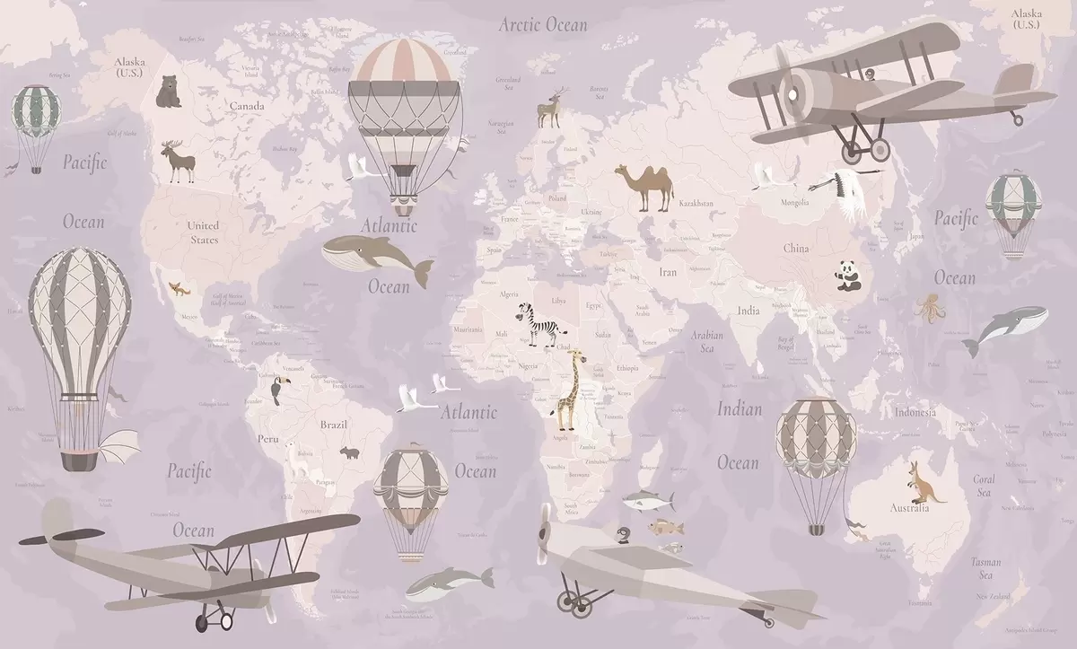 Papier peint Carte du monde pour enfants avec des animaux, des avions et des montgolfières. En anglais. Couleur violette. N° c00003env4