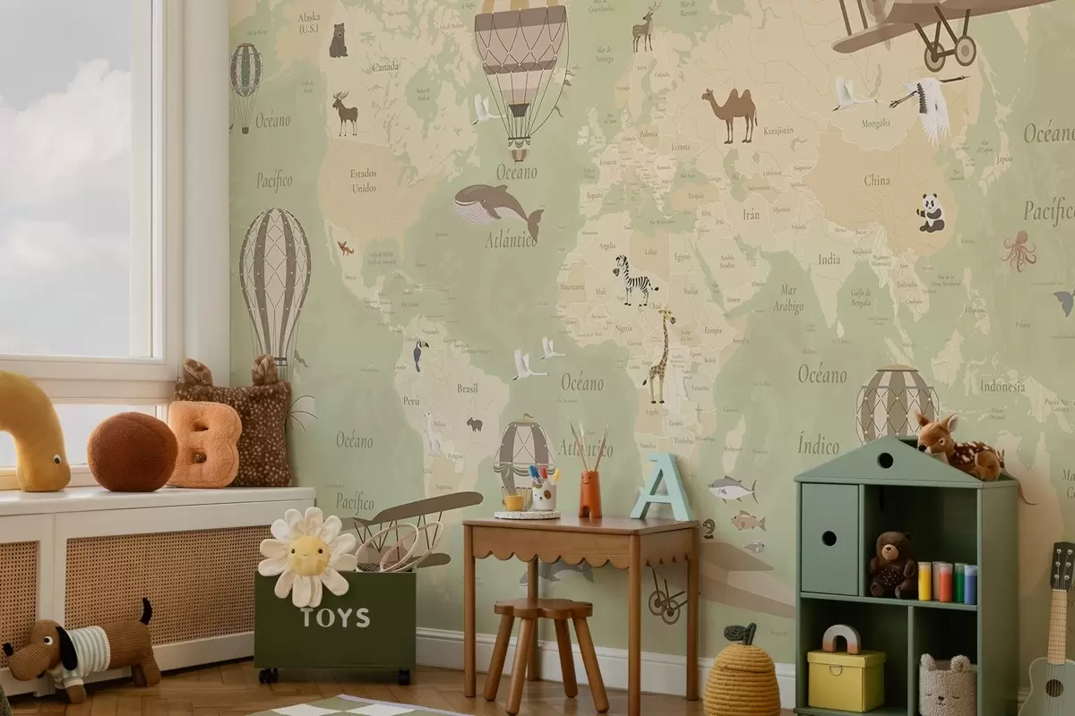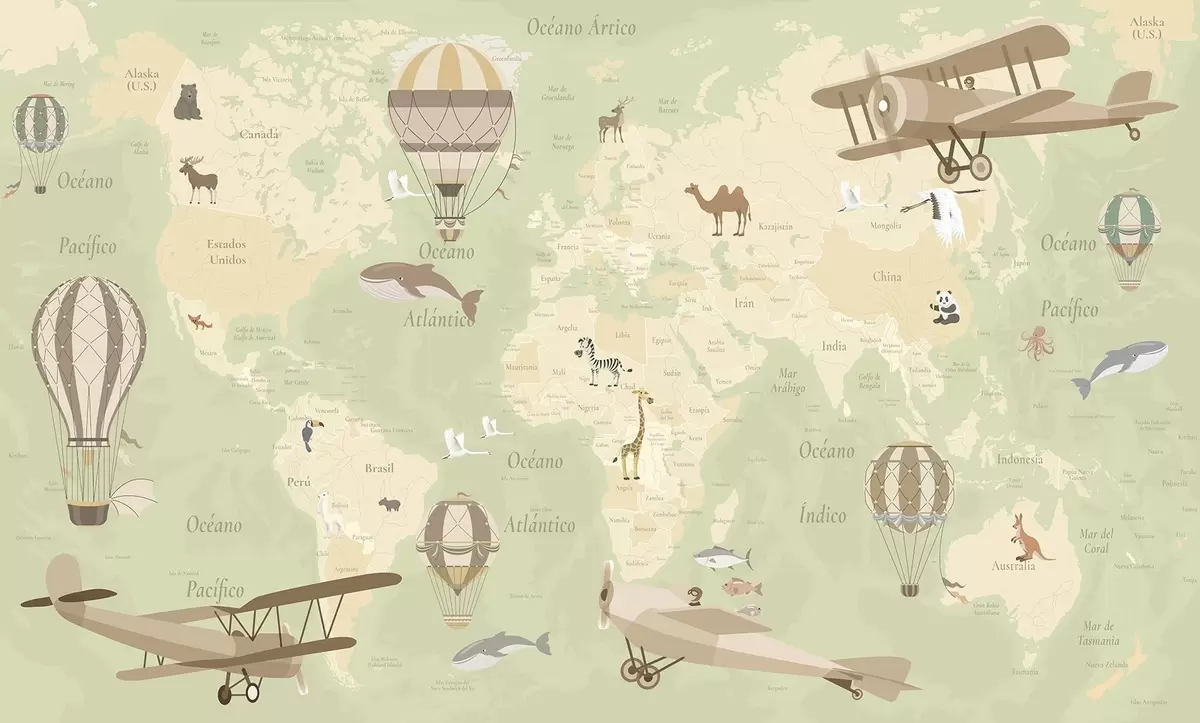 Papier peint Carte du monde pour enfants avec des animaux, des avions et des montgolfières. En espagnol. Couleur verte. N° c00003esv2