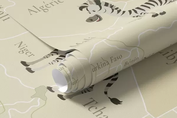 Papier peint Carte du monde pour enfants avec des animaux, des avions et des montgolfières. En français. Couleur verte. N° c00003frv2