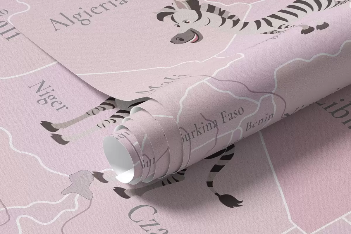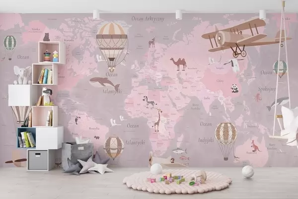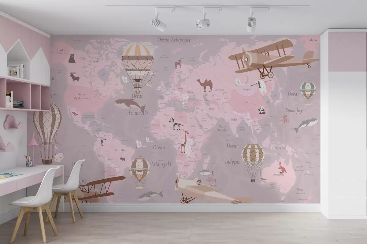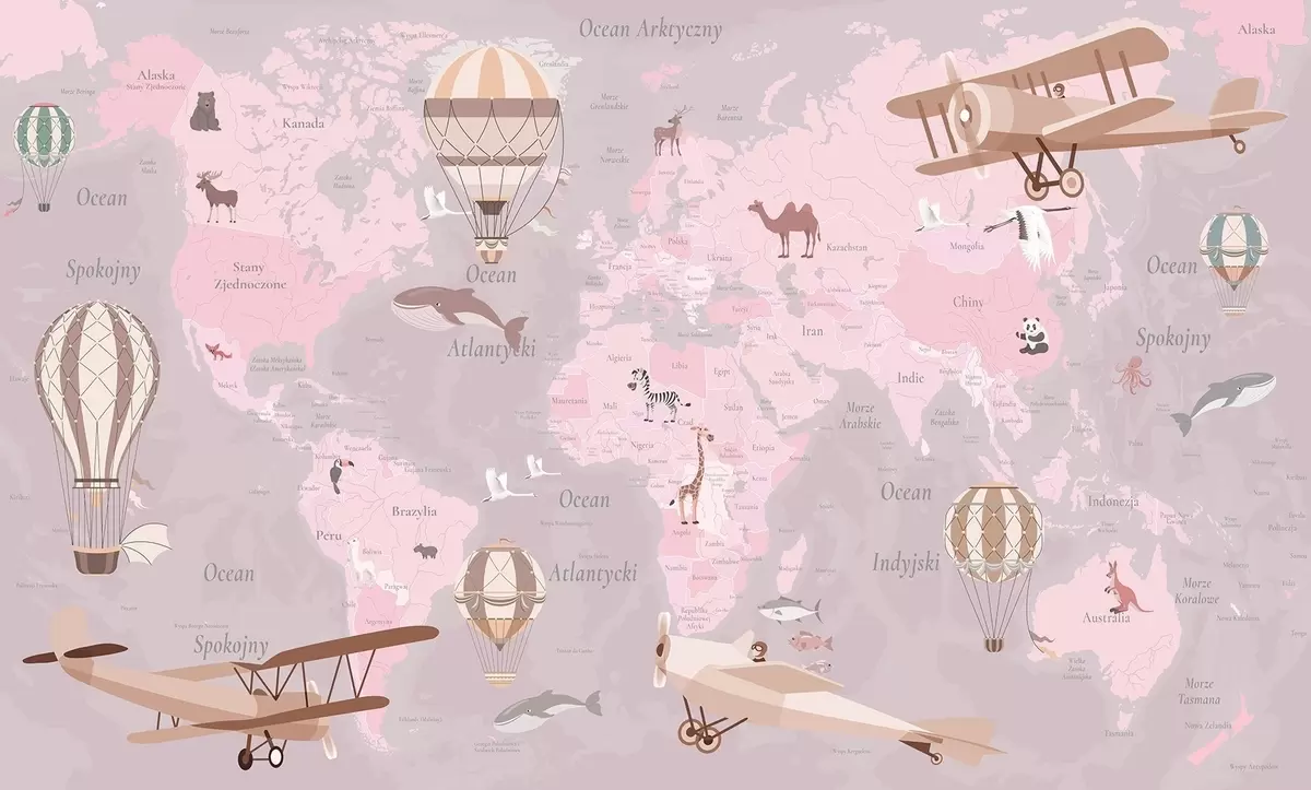 Papier peint Carte du monde pour enfants avec des animaux, des avions et des montgolfières. En polonais. Couleur rose. N° c00003plv3