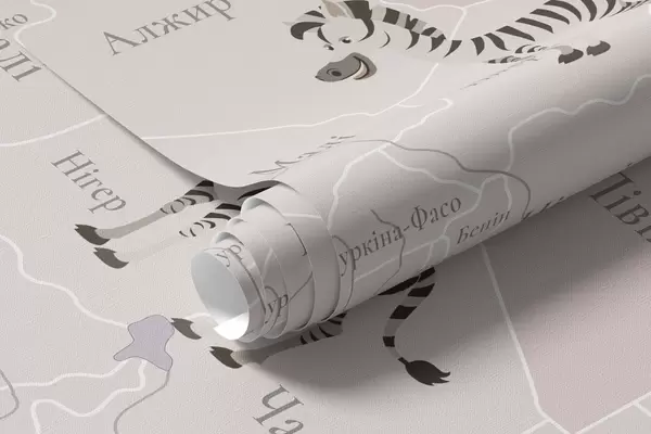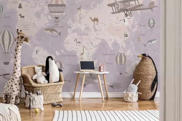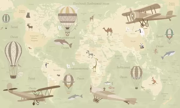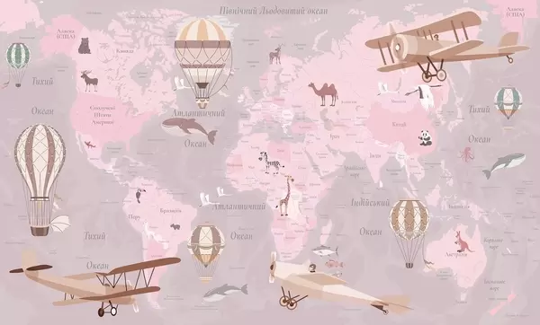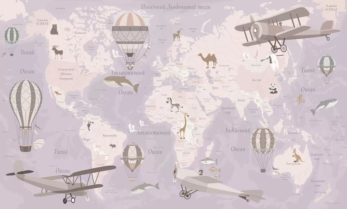 Papier peint Carte du monde pour enfants avec des animaux, des avions et des montgolfières. En ukrainien. Couleur violette. N° c00003ukv4