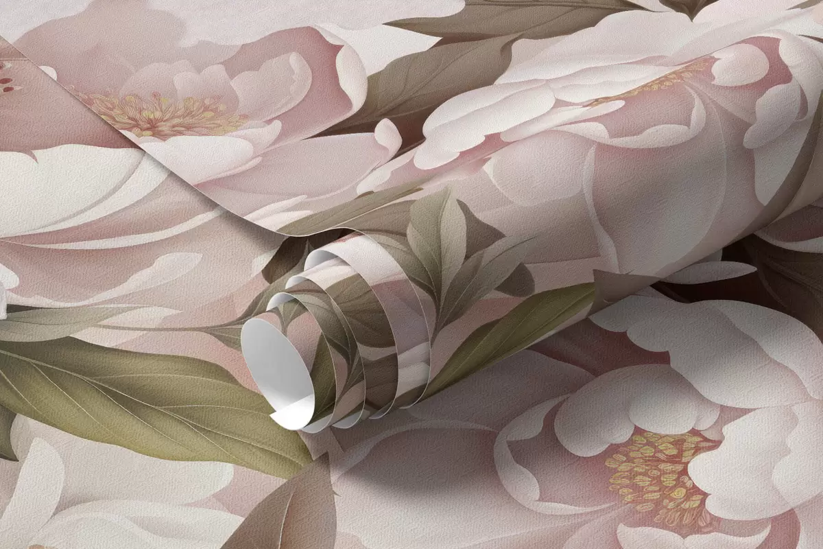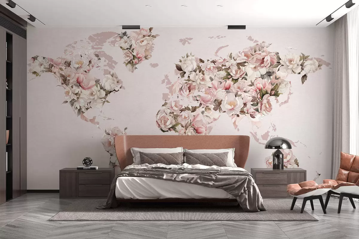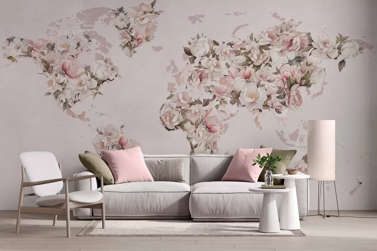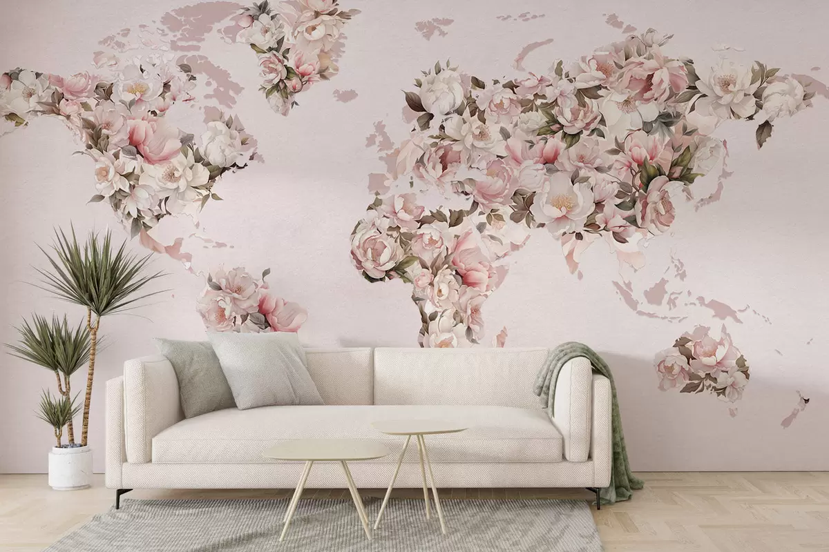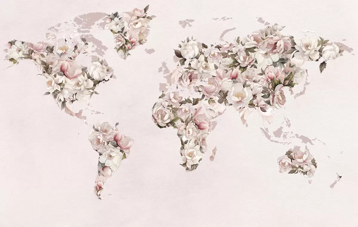 Papier peint Une carte du monde rose composée de grandes pivoines blanches et roses N° c00005