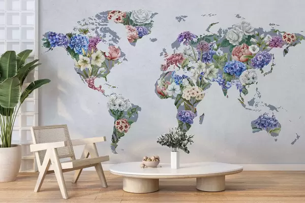 Papier peint Une carte du monde colorée, composée d'une variété de fleurs aux couleurs vives N° c00006