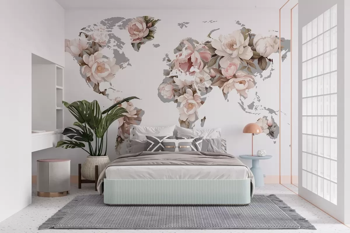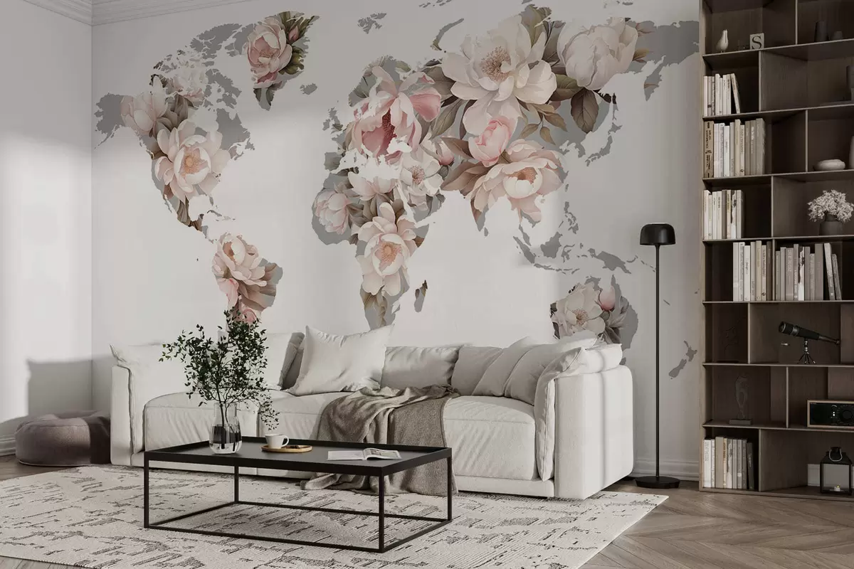 Papier peint Une carte du monde délicate et onctueuse, composée de fleurs N° c00008