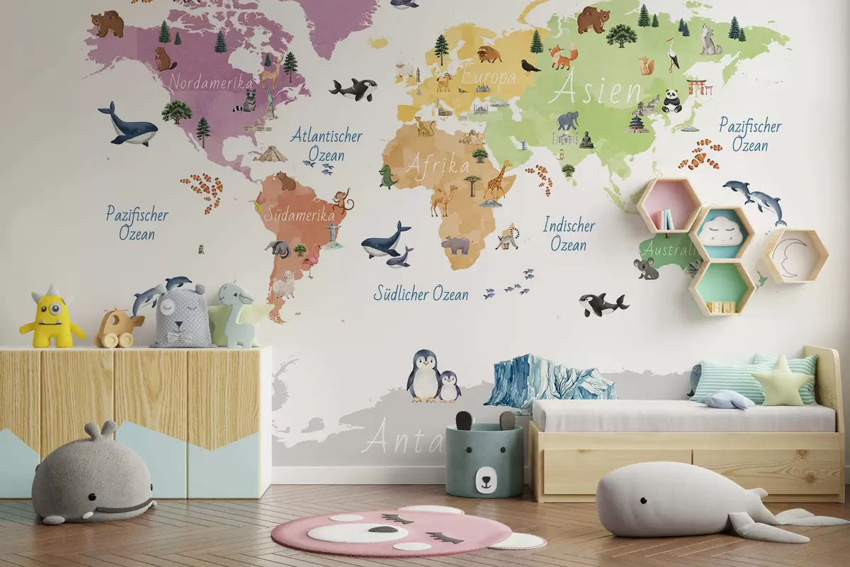 Papier peint Une carte en couleurs, de style aquarelle, représentant des animaux, des plantes et des bâtiments. Légendes en allemand N° c00009de