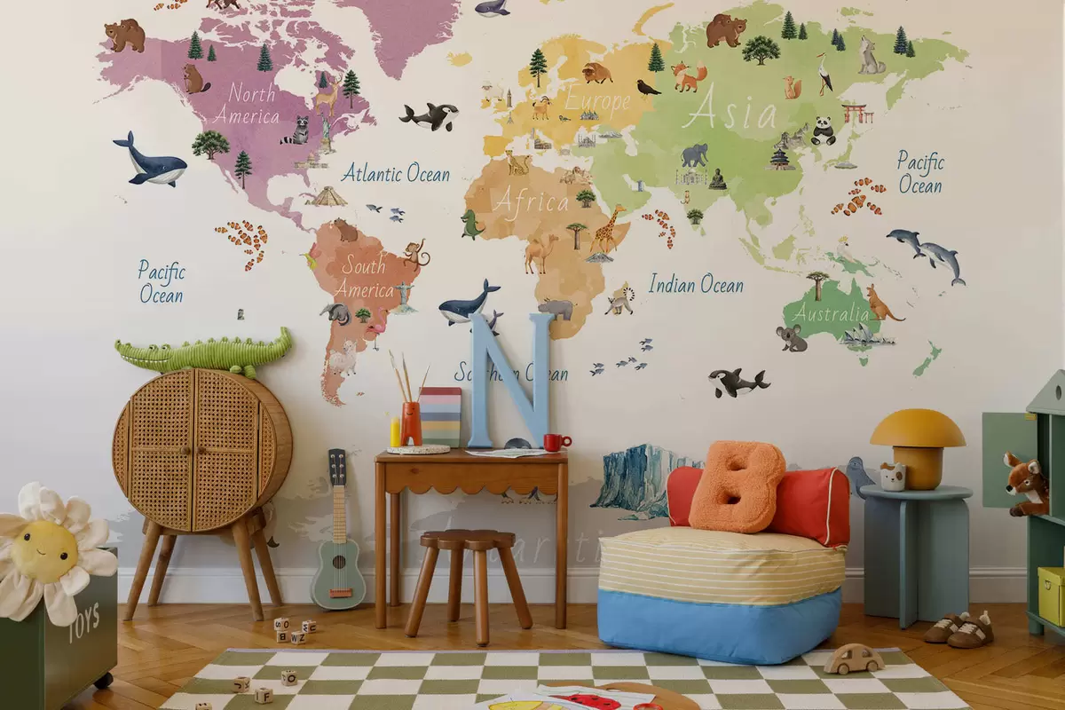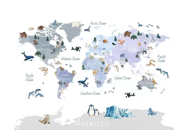 Papier peint Une carte en couleurs de style aquarelle représentant des animaux, des plantes et des bâtiments. Légendes en anglais N° c00009en
