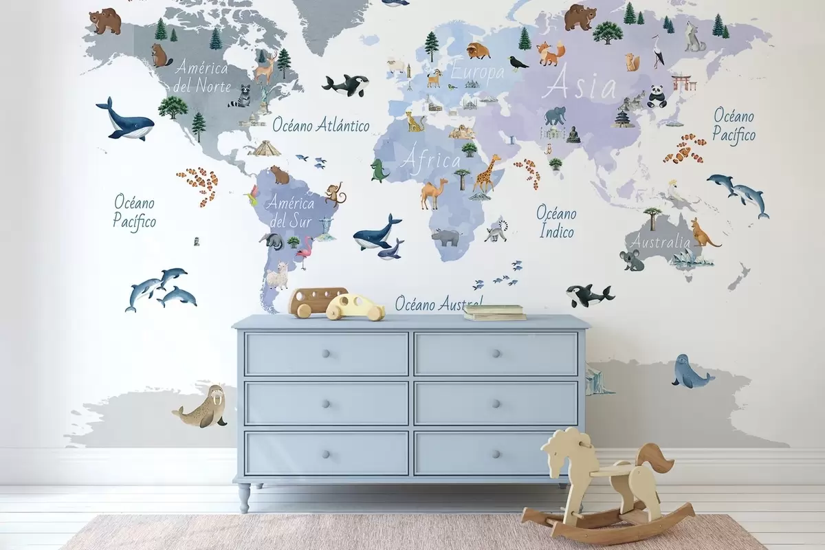 Papier peint Une carte bleue de style aquarelle représentant des animaux, des plantes et des bâtiments. Légendes en espagnol N° c00009esv1