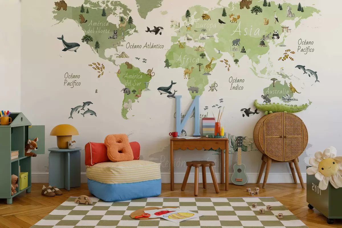 Papier peint Une carte verte de style aquarelle représentant des animaux, des plantes et des bâtiments. Légendes en espagnol N° c00009esv2