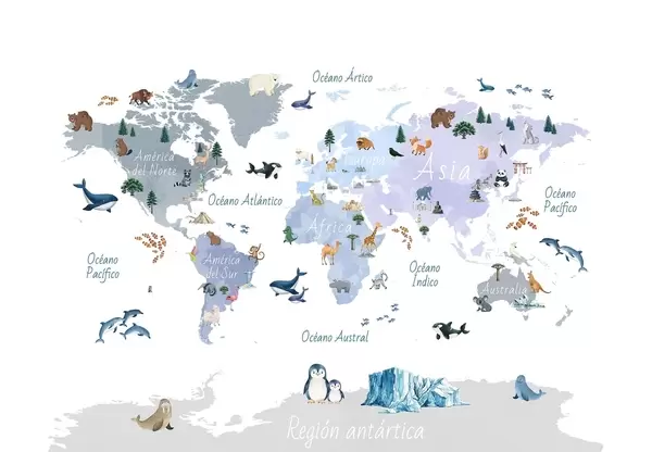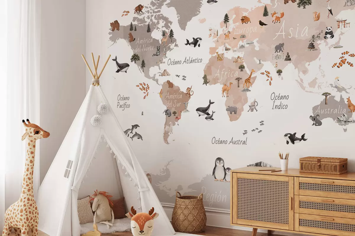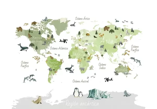 Papier peint Une carte de couleur beige, dans un style aquarelle, représentant des animaux, des plantes et des bâtiments. Légendes en espagnol N° c00009esv3