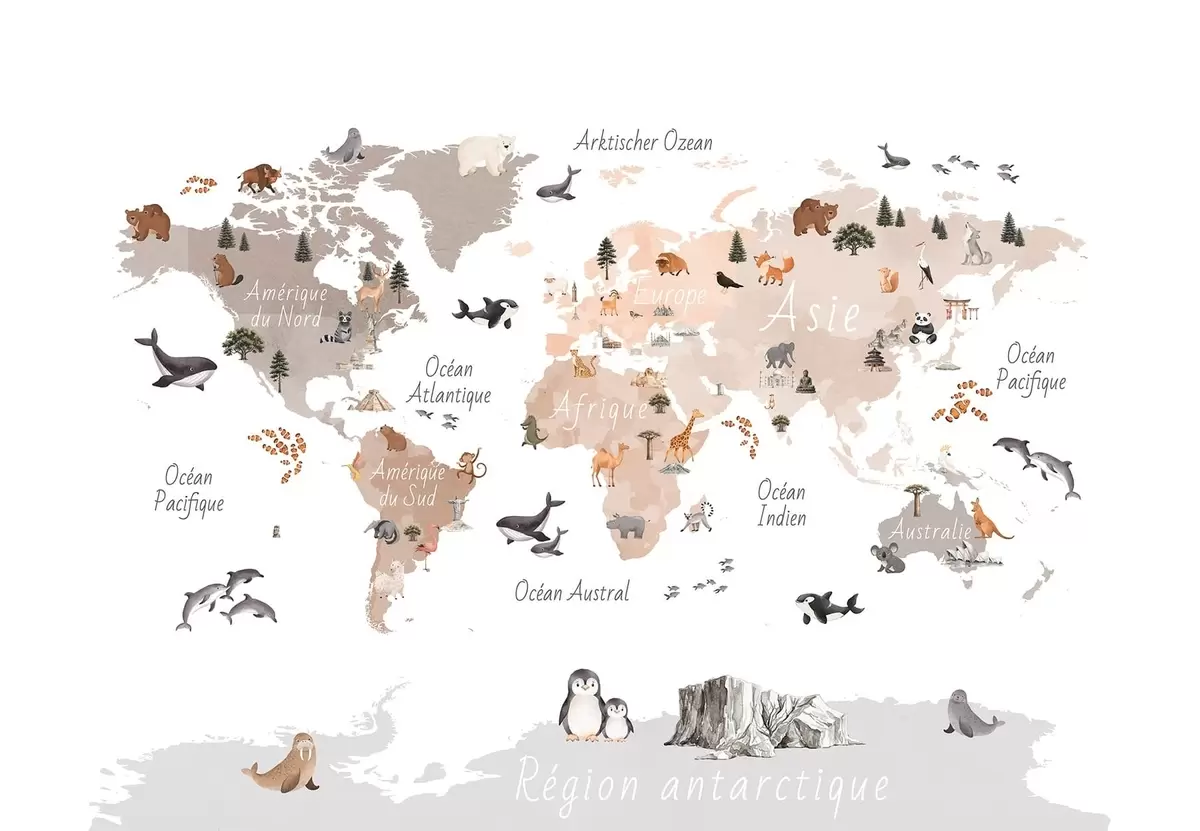 Papier peint Une carte de style aquarelle, de couleur beige, représentant des animaux, des plantes et des bâtiments. Légendes en français N° c00009frv3