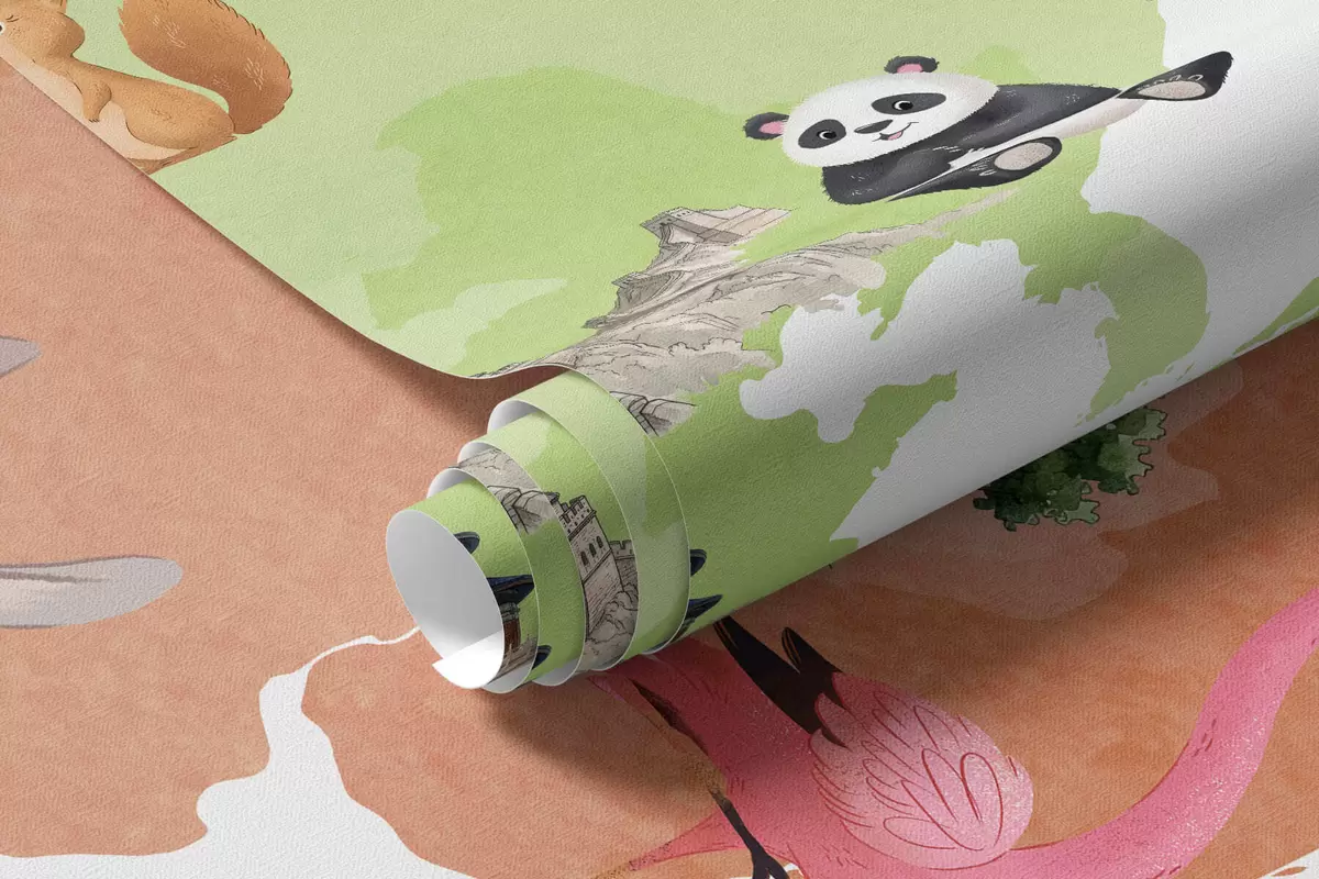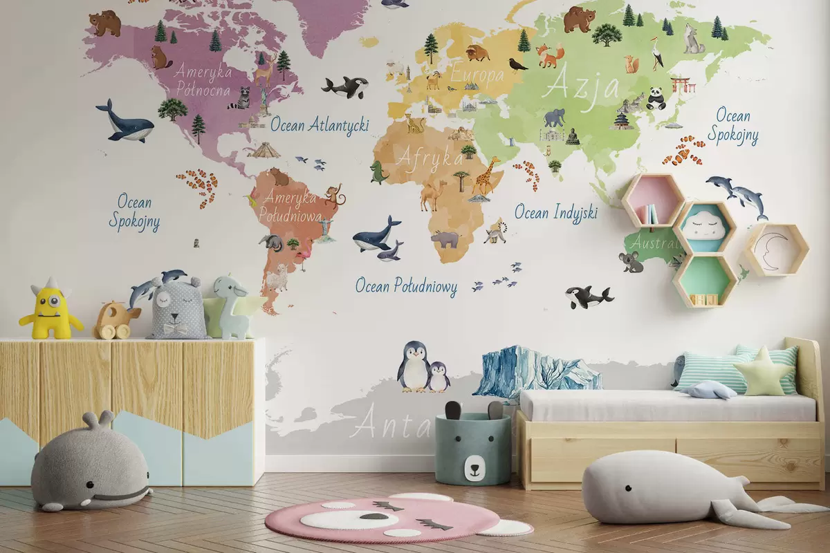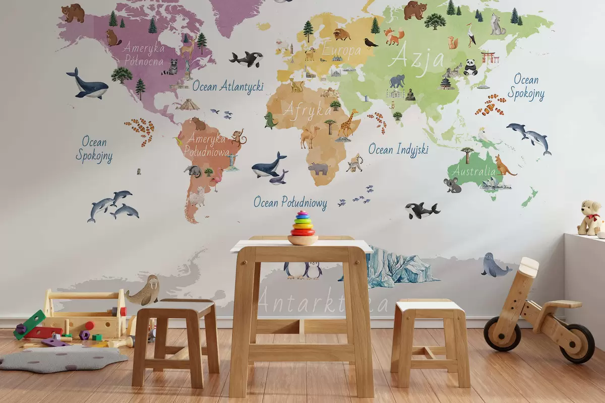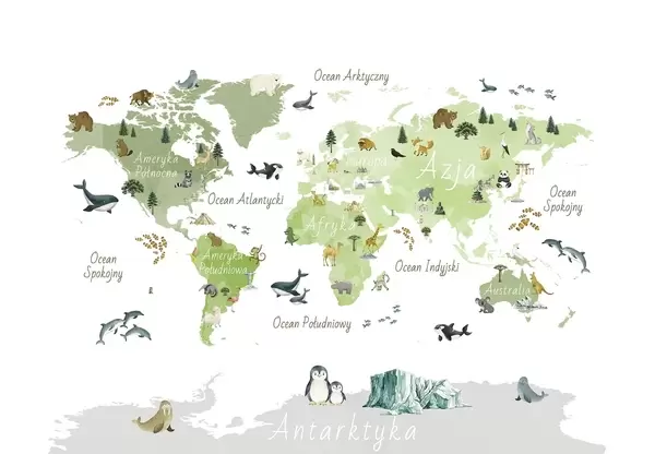 Papier peint Une carte en couleurs de style aquarelle représentant des animaux, des plantes et des bâtiments. Légendes en polonais N° c00009pl