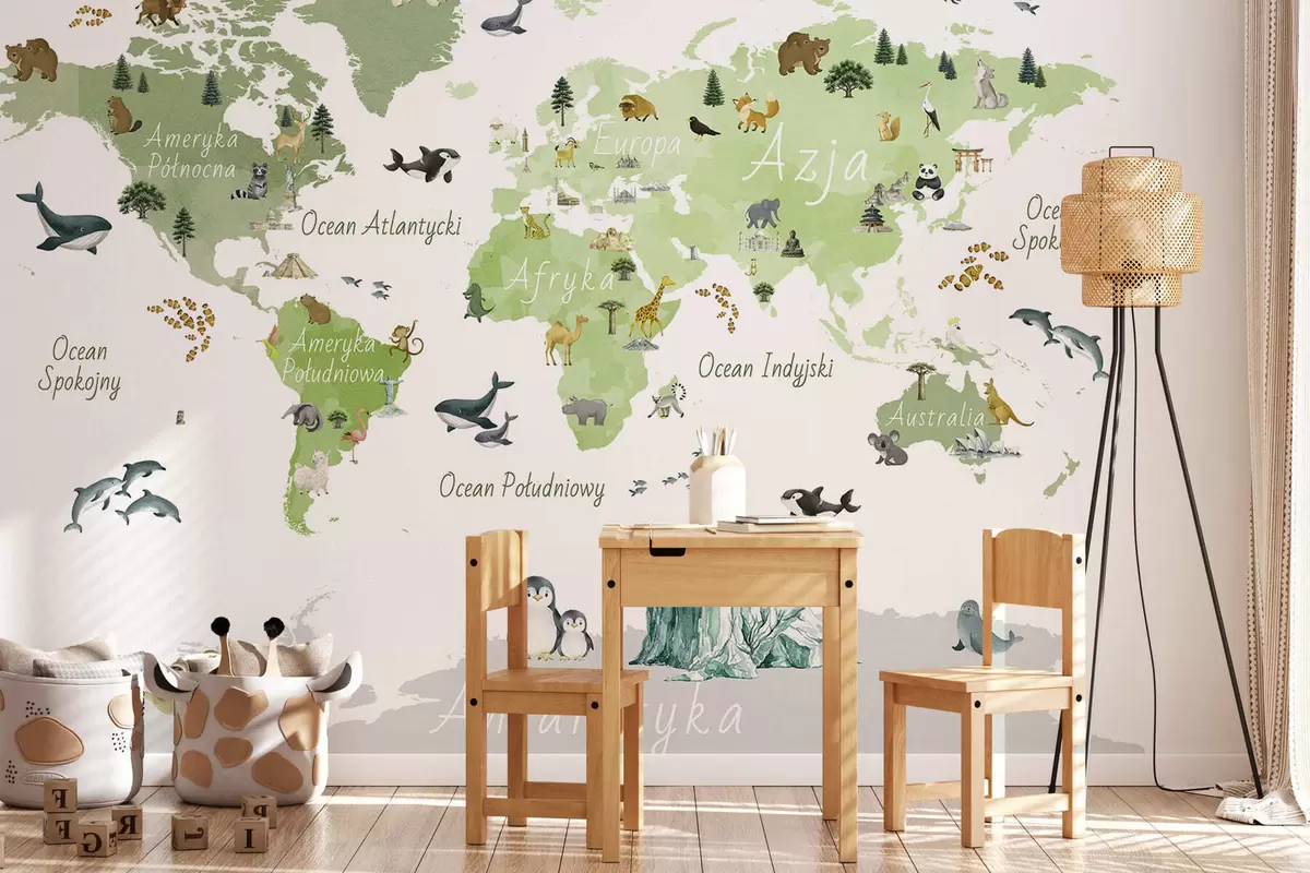 Papier peint Une carte verte de style aquarelle représentant des animaux, des plantes et des bâtiments. Légendes en polonais N° c00009plv2