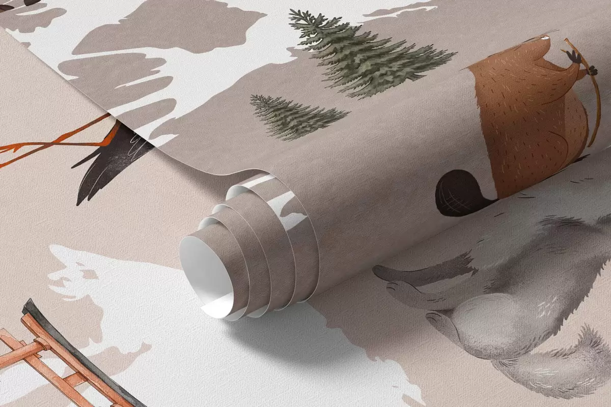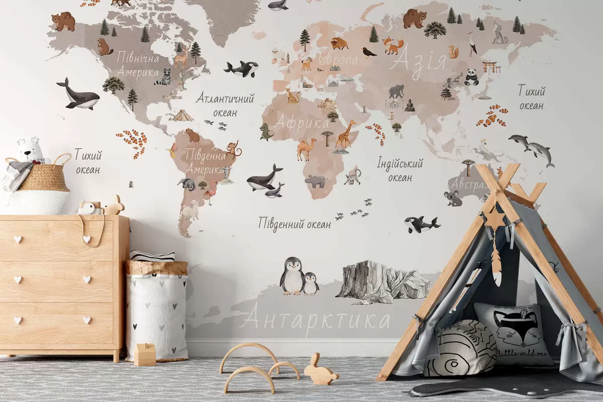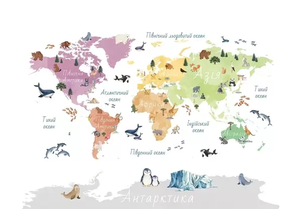 Papier peint Une carte de couleur beige, dans un style aquarelle, représentant des animaux, des plantes et des bâtiments. Légendes en ukrainien N° c00009ukv3