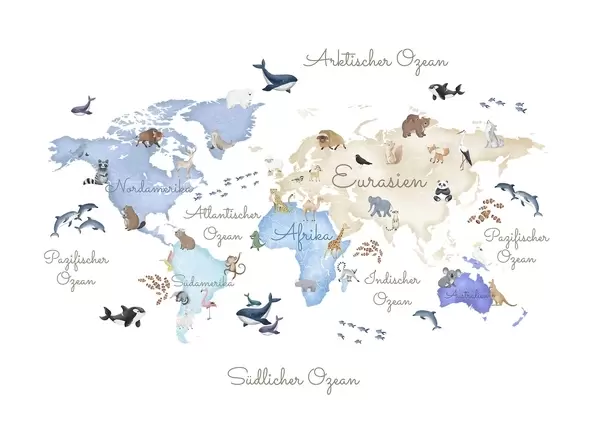 Papier peint Une carte bleue de style aquarelle représentant des animaux. Légendes en allemand N° c00012dev1