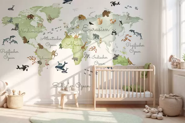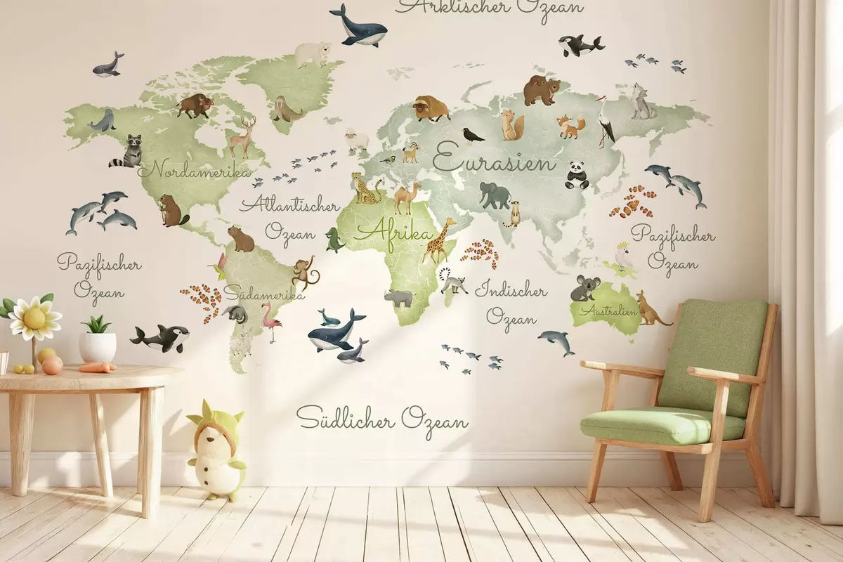 Papier peint Une carte verte de style aquarelle mettant en scène des animaux. Légendes en allemand N° c00012dev2