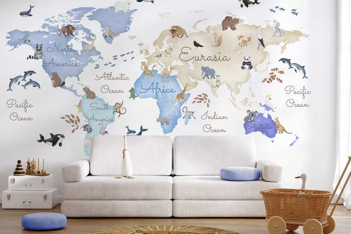 Papier peint Une carte bleue de style aquarelle représentant des animaux. Légendes en anglais N° c00012env1