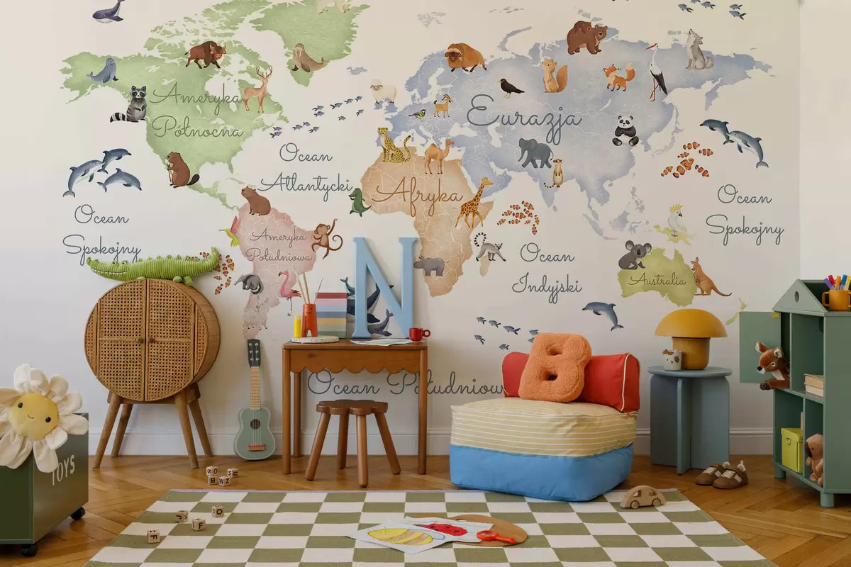 Papier peint Une carte en couleurs de style aquarelle représentant des animaux. Légendes en polonais N° c00012pl