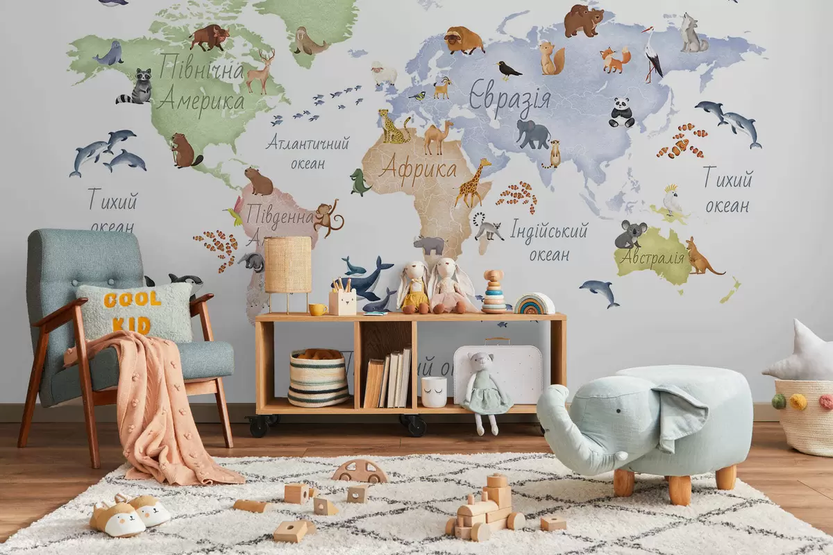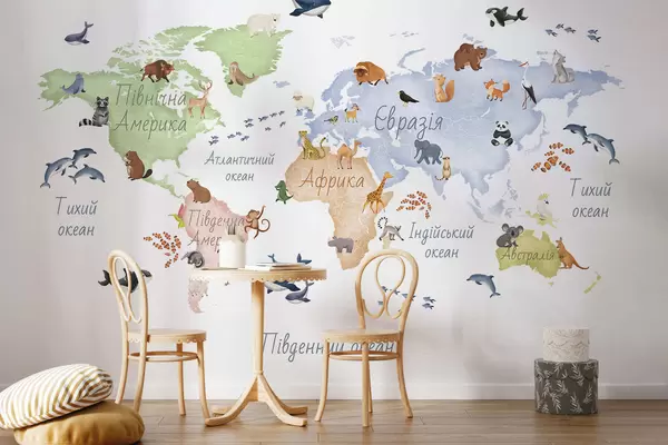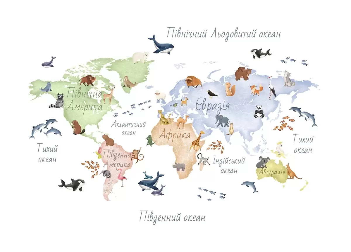 Papier peint Une carte en couleurs de style aquarelle représentant des animaux. Légendes en ukrainien N° c00012uk