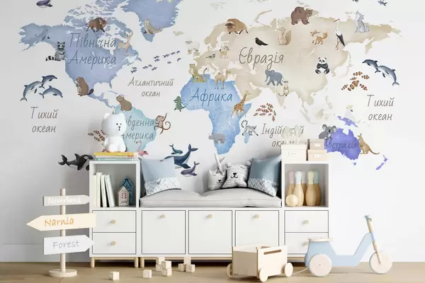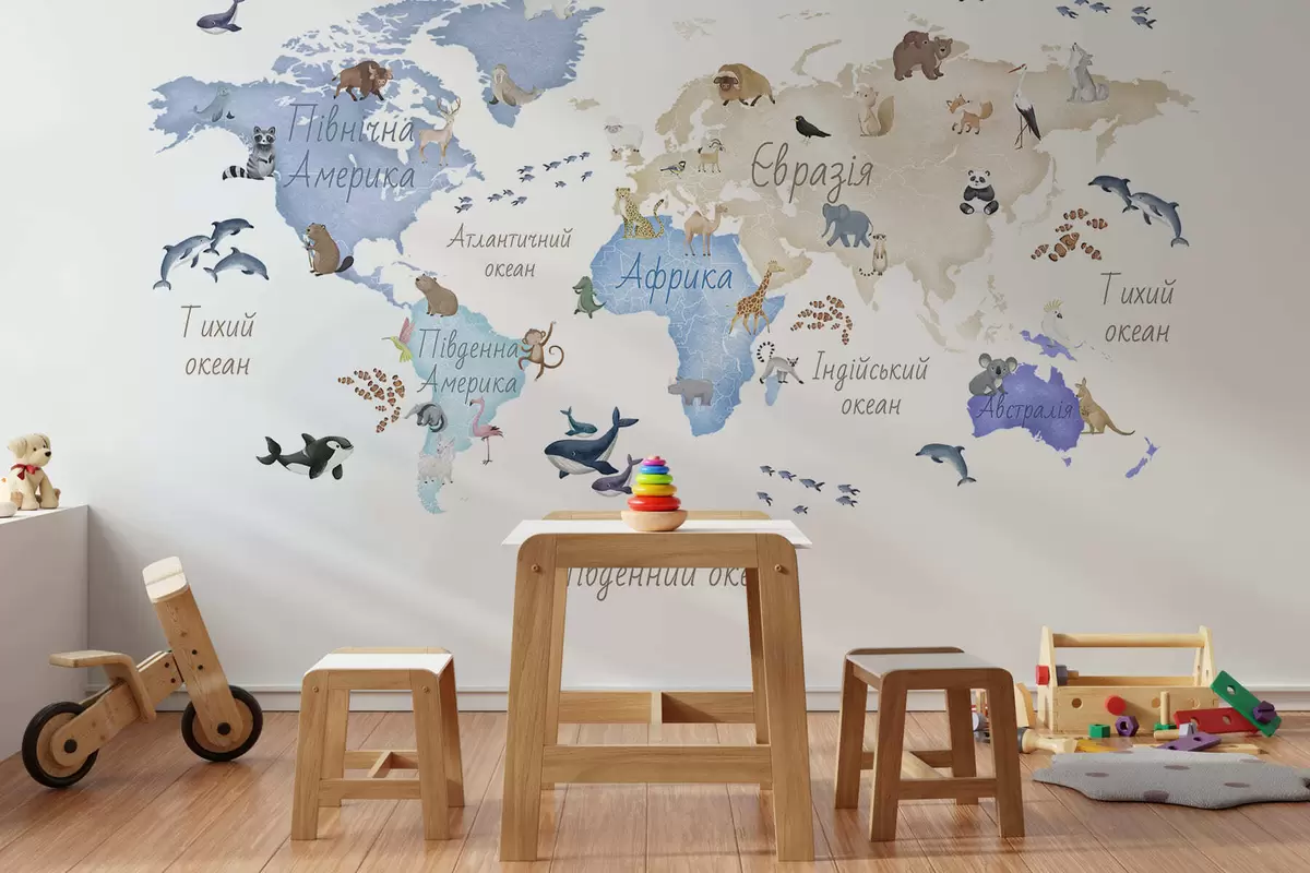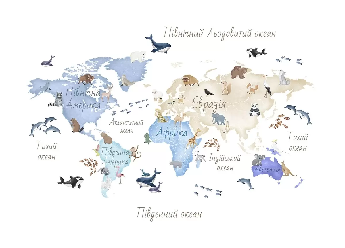 Papier peint Une carte bleue de style aquarelle représentant des animaux. Légendes en ukrainien N° c00012ukv1