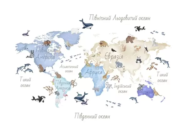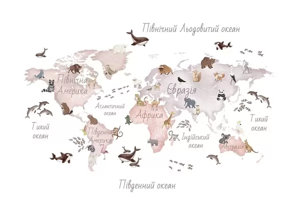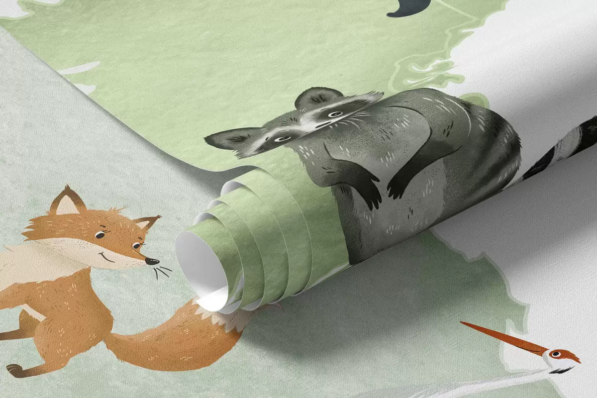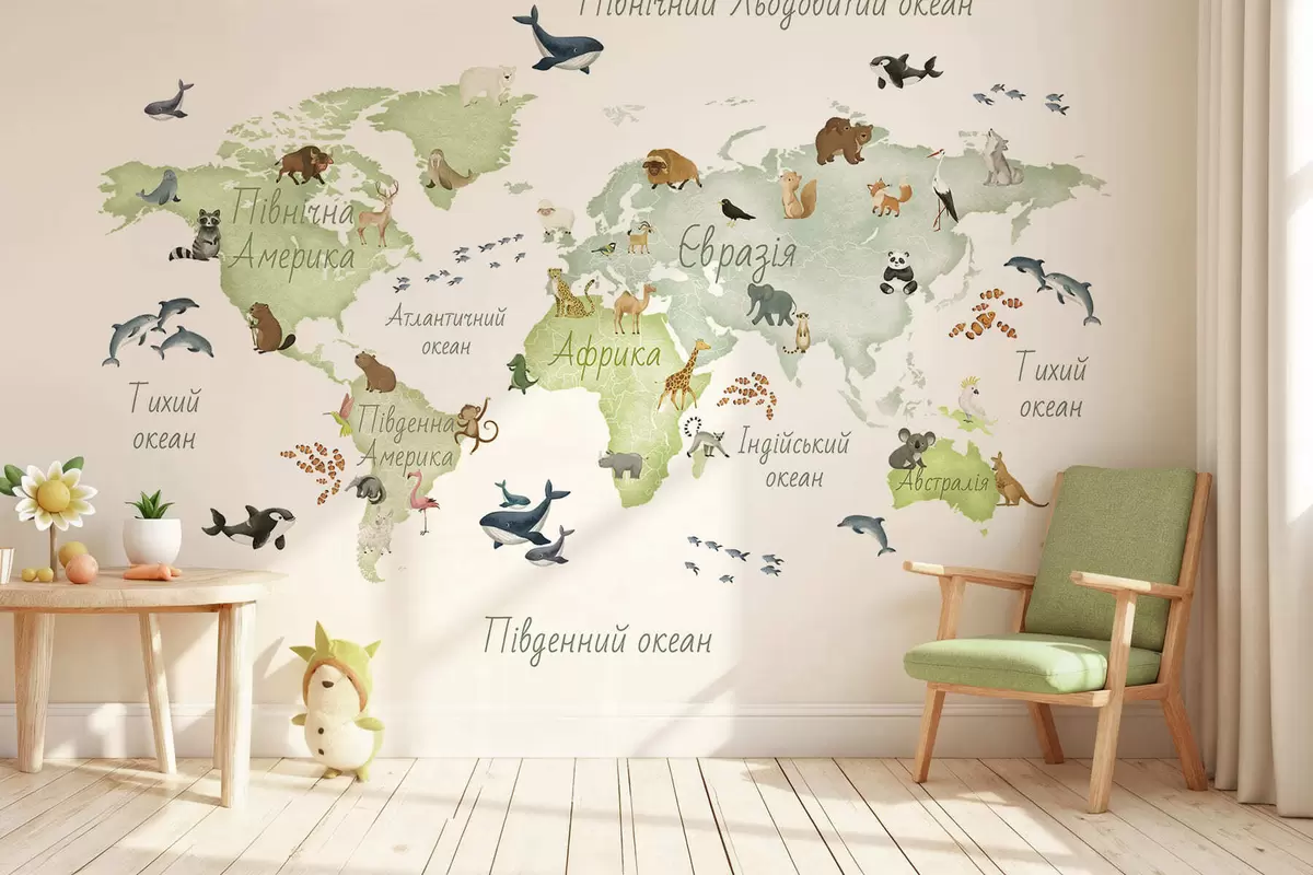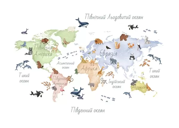 Papier peint Une carte verte de style aquarelle mettant en scène des animaux. Légendes en ukrainien N° c00012ukv2