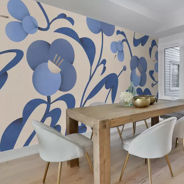 Papier peint Imprimé botanique avec des fleurs décoratives bleues sur un fond beige N° u99196v7