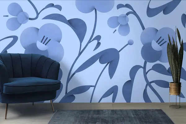 Papier peint Imprimé botanique avec fleurs décoratives en bleu N° u99196v8