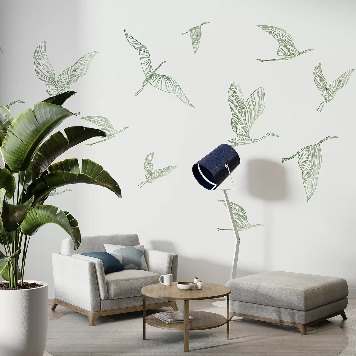 Papier peint Dessin au trait d'oiseaux volants, minimalisme, nature, couleurs vertes N° w00758v2