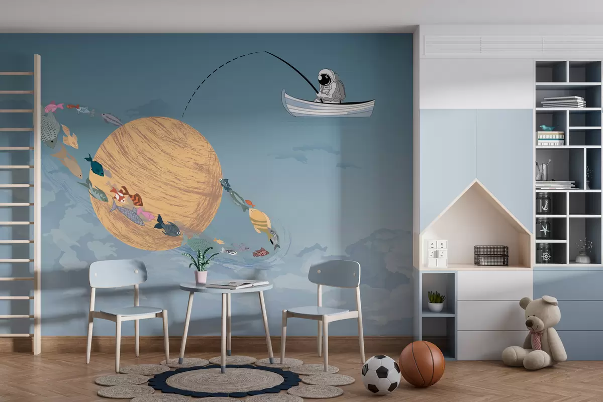 Papier peint Lune d’astronaute et poisson en bleu N° w00869v1