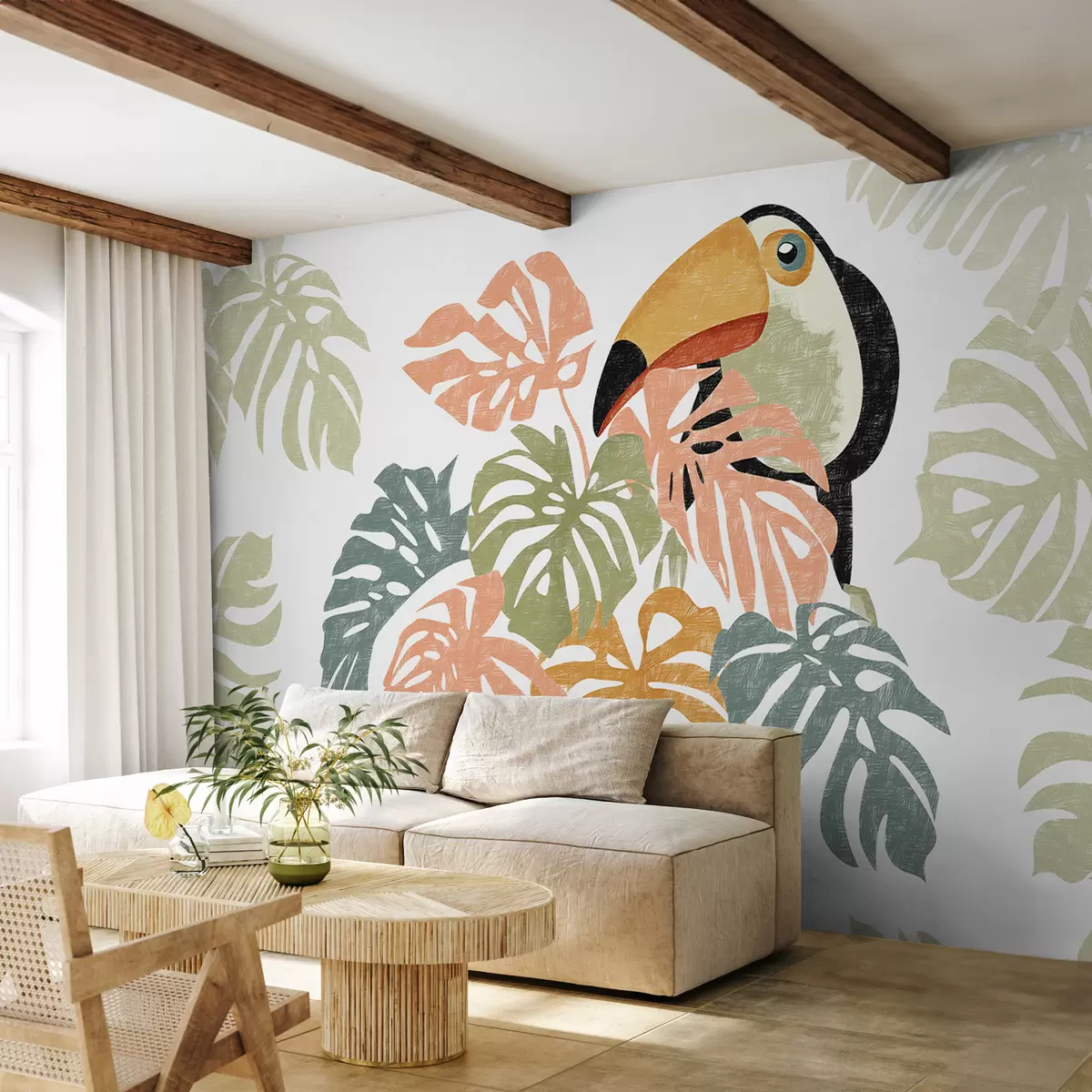 Papier peint Toucan assis dans un feuillage tropical de monstera, dessin imitation trait N° w01009