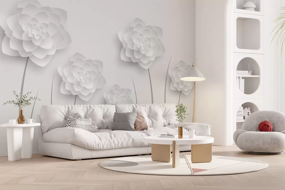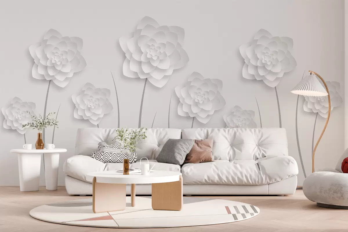 Papier peint Grandes fleurs avec imitation de volume en style papier sur fond gris clair avec une tige grise N° w01021
