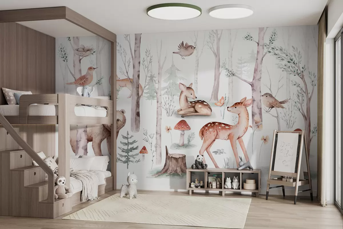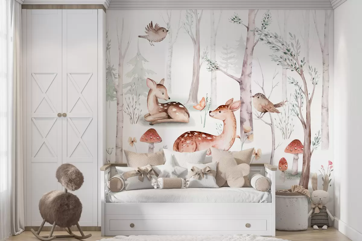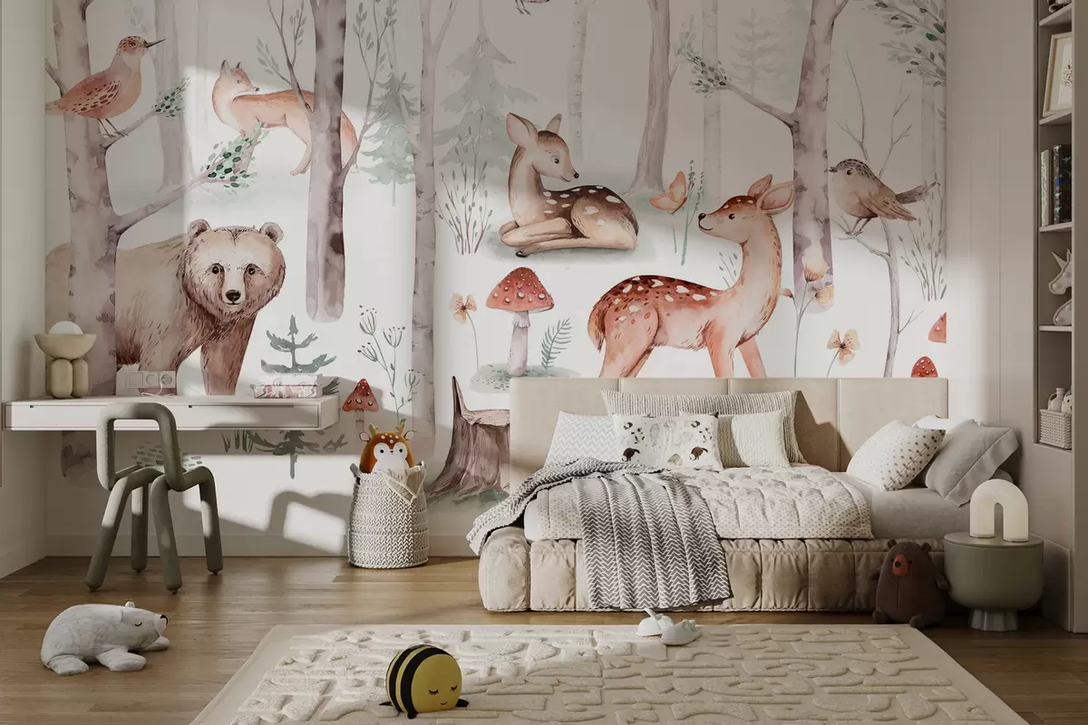 Papier peint Papier peint pour chambre d'enfant, animaux de la forêt. Papier peint délicat de style aquarelle dans d'agréables couleurs pastel chaudes sur un fond blanc N° w01089