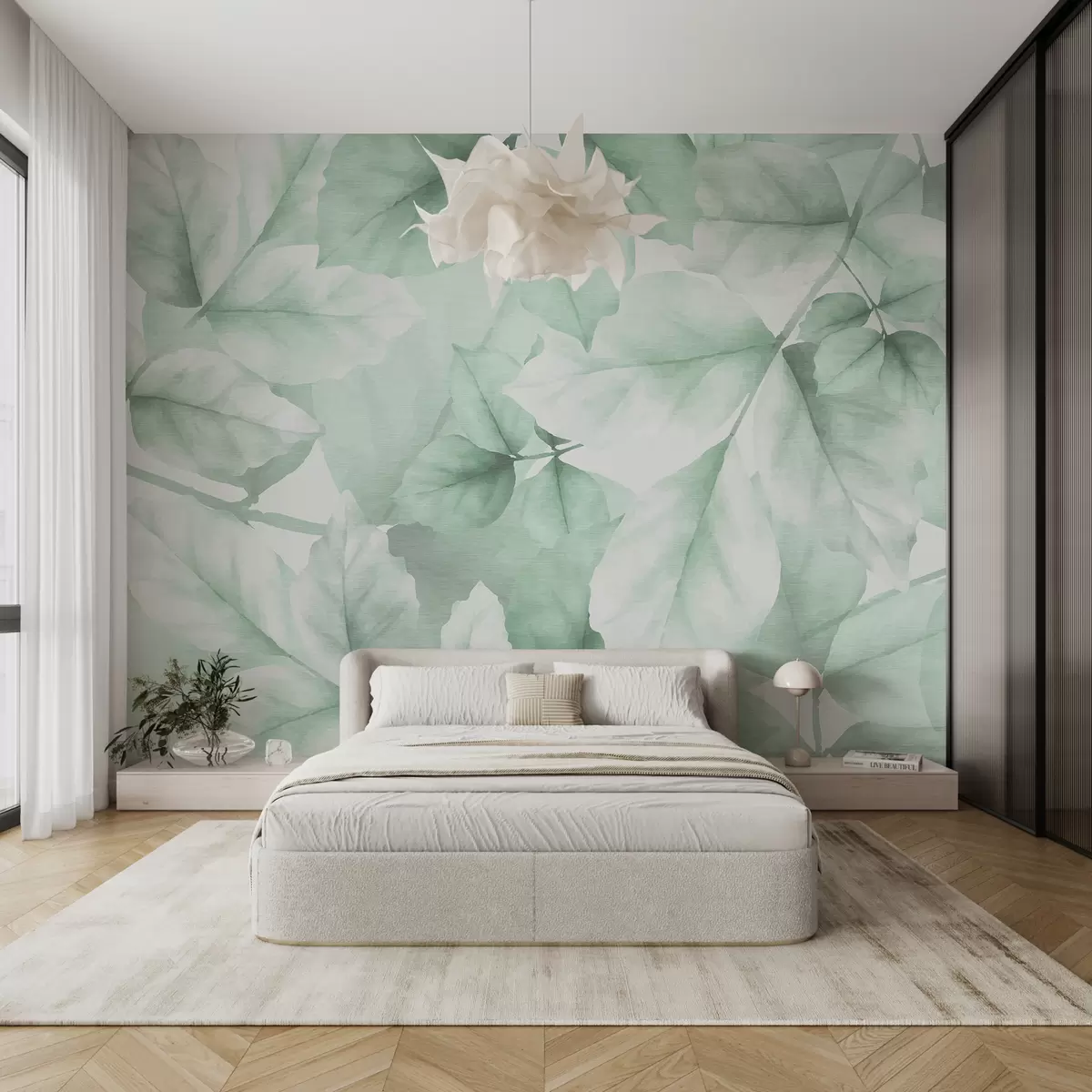 Papier peint Papier peint texturé avec de grandes feuilles dans des tons verts pastel N° w01090v3