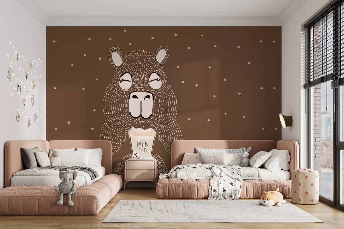 Papier peint Grand capybara mignon avec un tee-shirt à bulles dans un style minimaliste sur un fond marron pointillé N° w01122v2