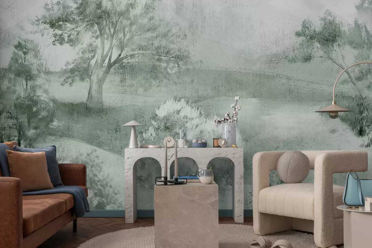 Papier peint Peinture de paysage représentant une scène de campagne brumeuse entourée d'arbres luxuriants et de feuillages dans des tons de bleu N° w01247v2