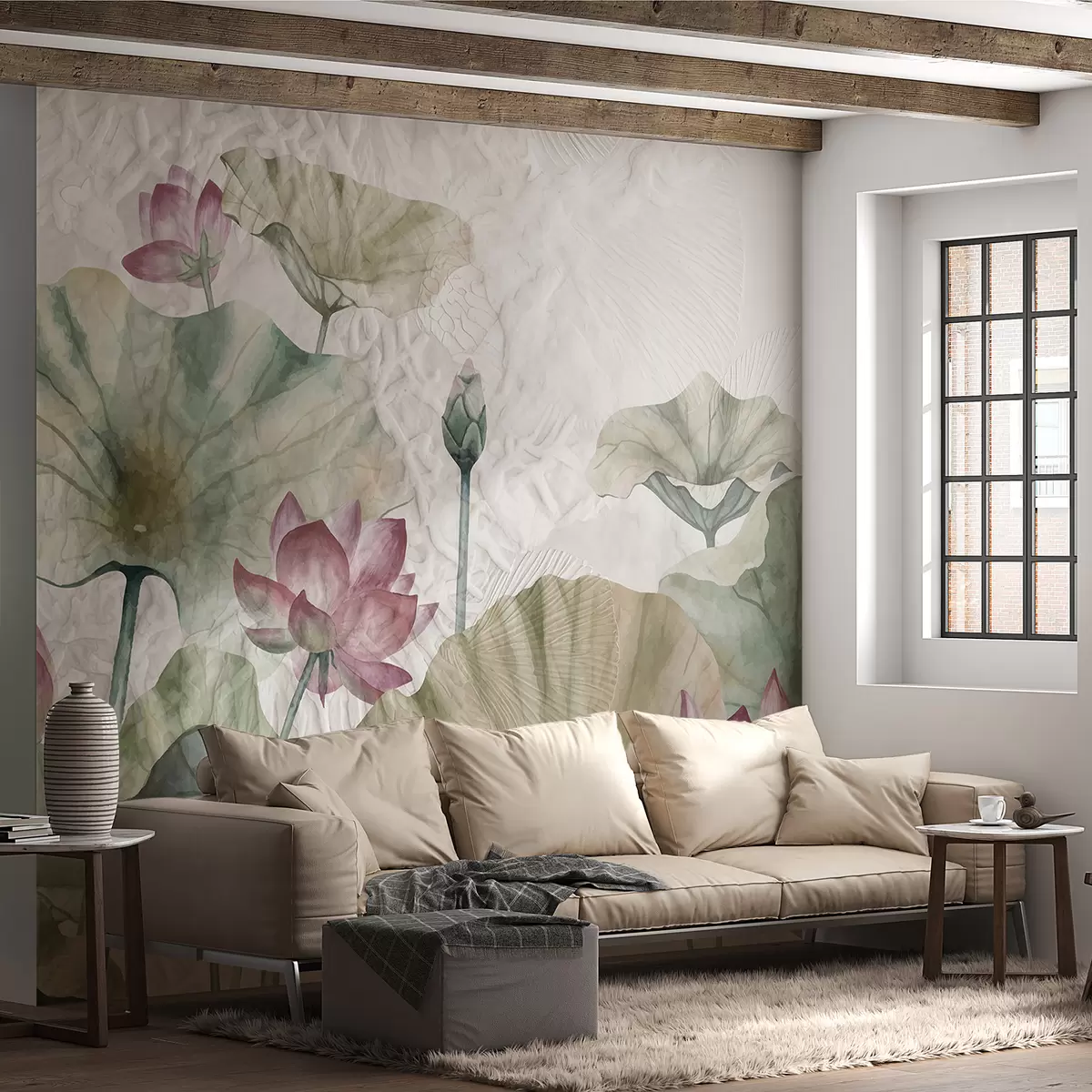 Papier peint Fleurs de lotus roses avec des feuilles vertes sur un fond légèrement texturé N° w01248